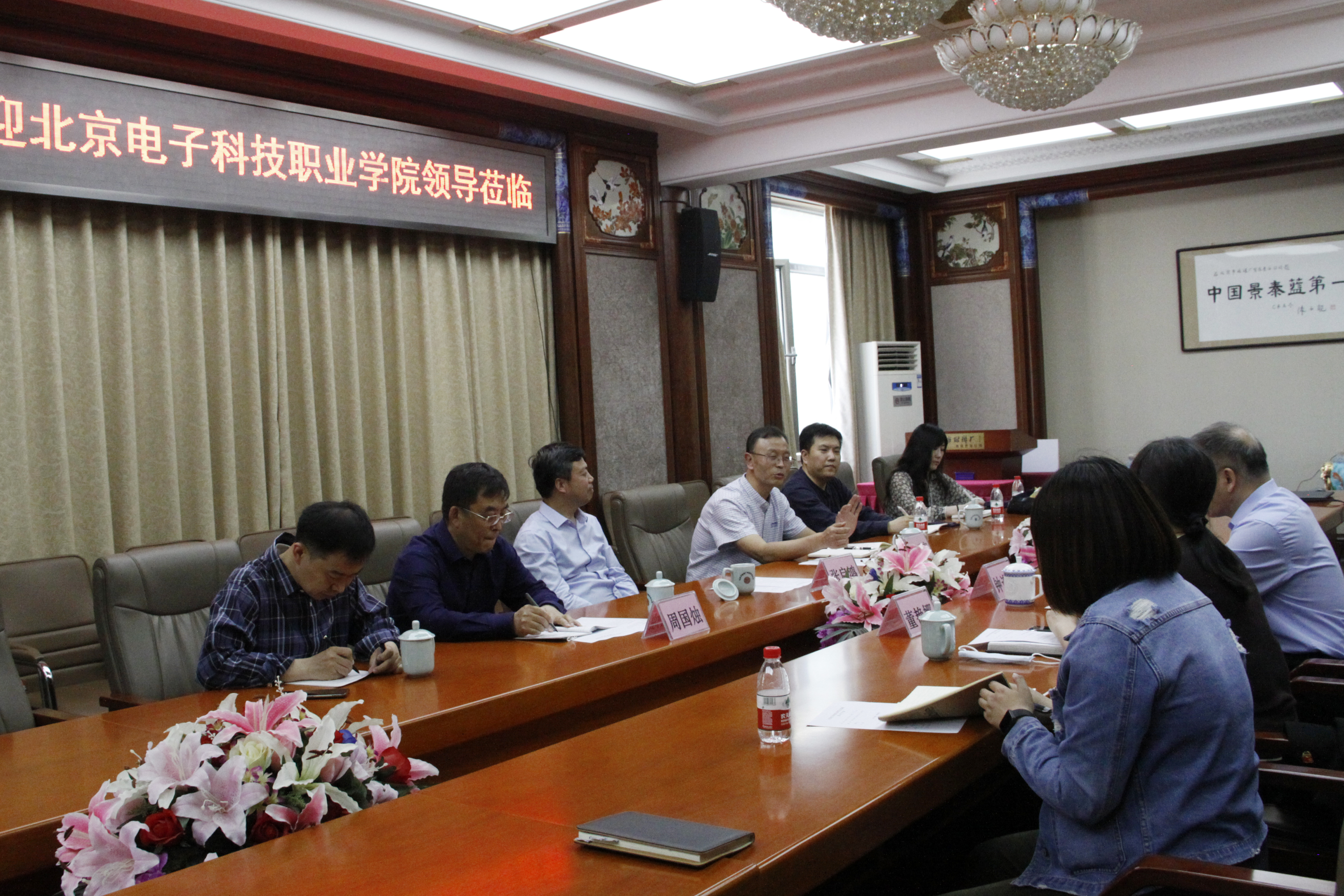 参观后,双方在古色古香、由景泰蓝工艺装饰的特色会议室内就校企合作、产教融合开展了热烈交谈。刘正宏介绍了学院与北京市珐琅厂有限公司校企合作历程,回顾了在钟大师支持下的项目成果,着重介绍了本校钟连盛景泰蓝技术技能工作室的建设运行情况。钟连盛大师也特别指出,我院是北京最早与珐琅厂开展景泰蓝技艺传承项目的高职院校,近些年校企合作成果可喜,期待进一步发展。