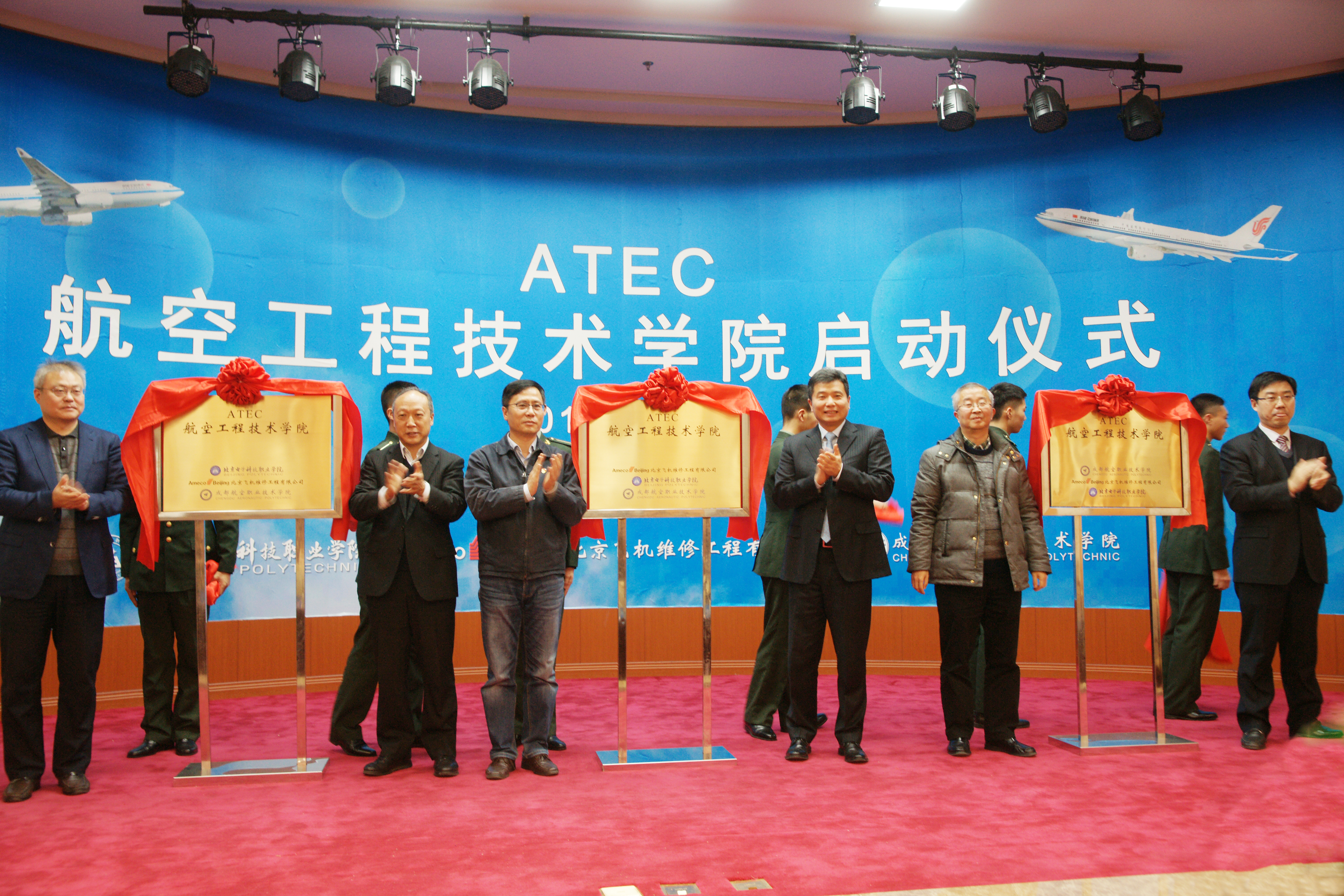 揭牌仪式在热烈的掌声中进行,合作三方主要领导一同上台为学院揭牌,随着红绸布的缓缓落下,承担着首都民航技术技能人才培养重任的“航空工程技术学院”正式成立了。