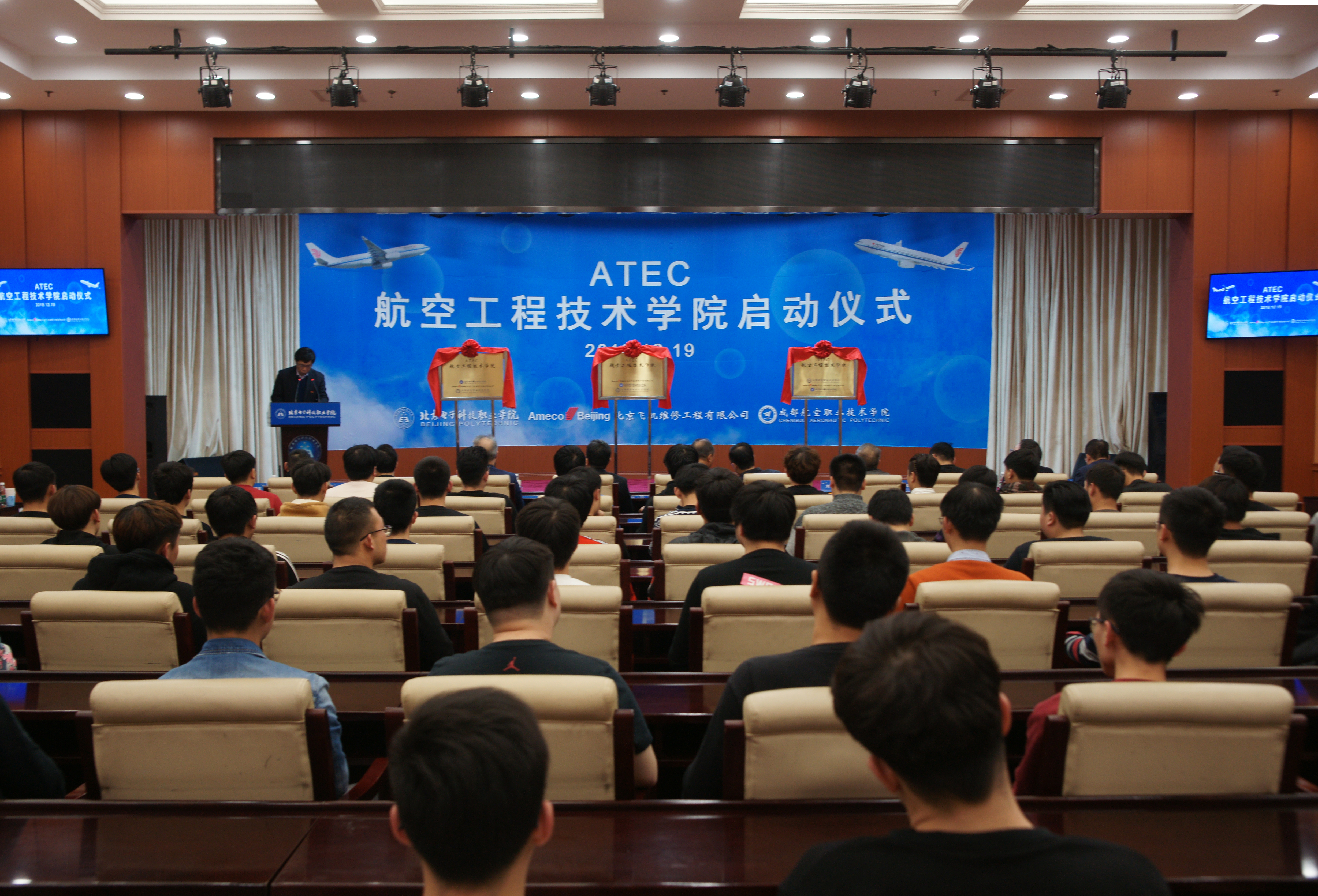 12月19日,由北京飞机维修工程有限公司、北京电子科技职业学院和成都航空职业技术学院共同成立的“航空工程技术学院(ATEC)”启动仪式在BEAT365举行。北京市教育委员会职成处处长王东江,北京飞机维修工程有限公司党委书记陈伦、副总裁朱派波、培训部总经理刘英俊,成都航空职业技术学院副院长刘建超,北京电子科技职业学院党委书记楚国清、院长孙善学、副院长安江英、么居标和航空维修专业全体师生参加了启动仪式。安江英主持启动仪式。