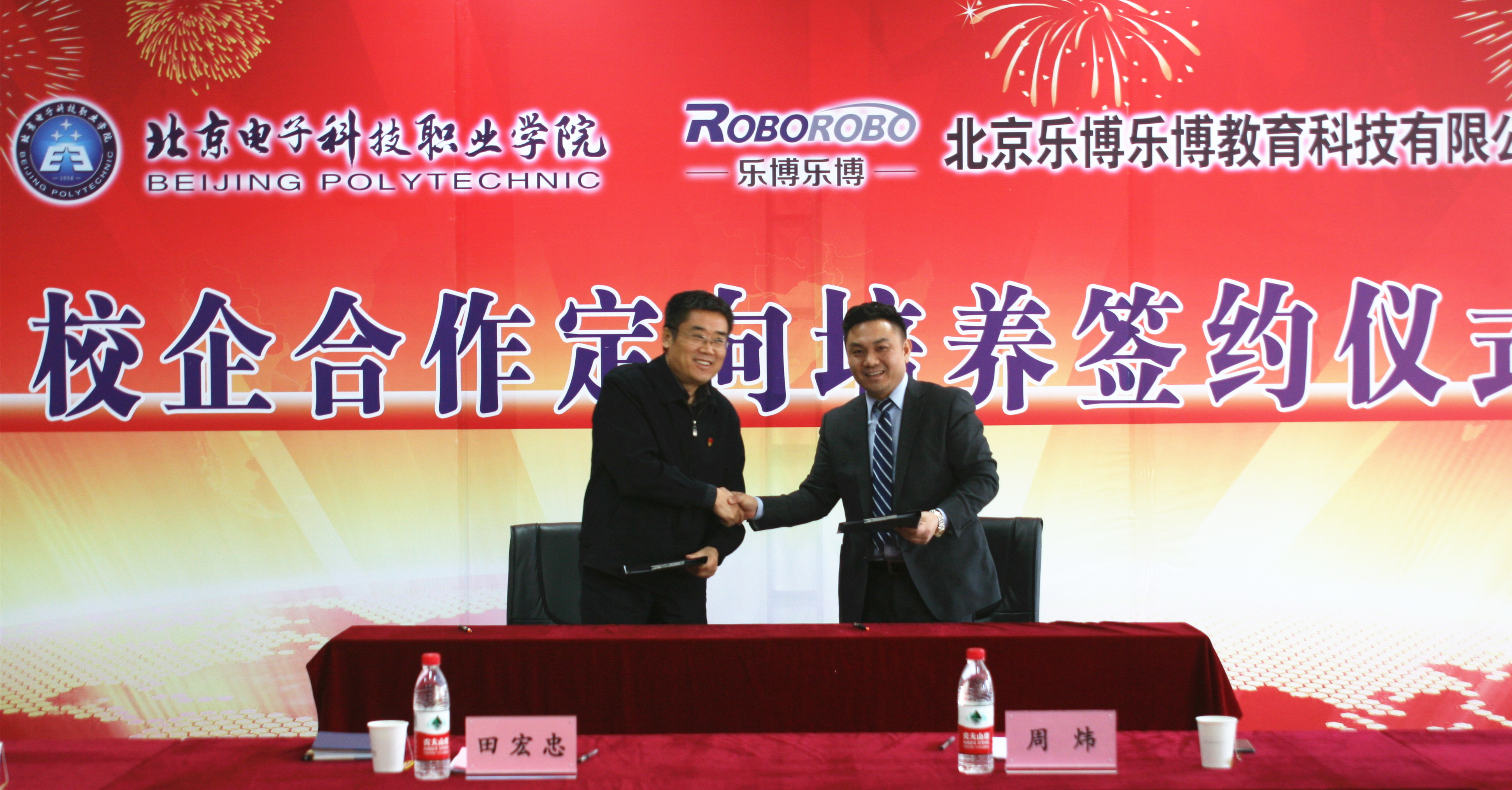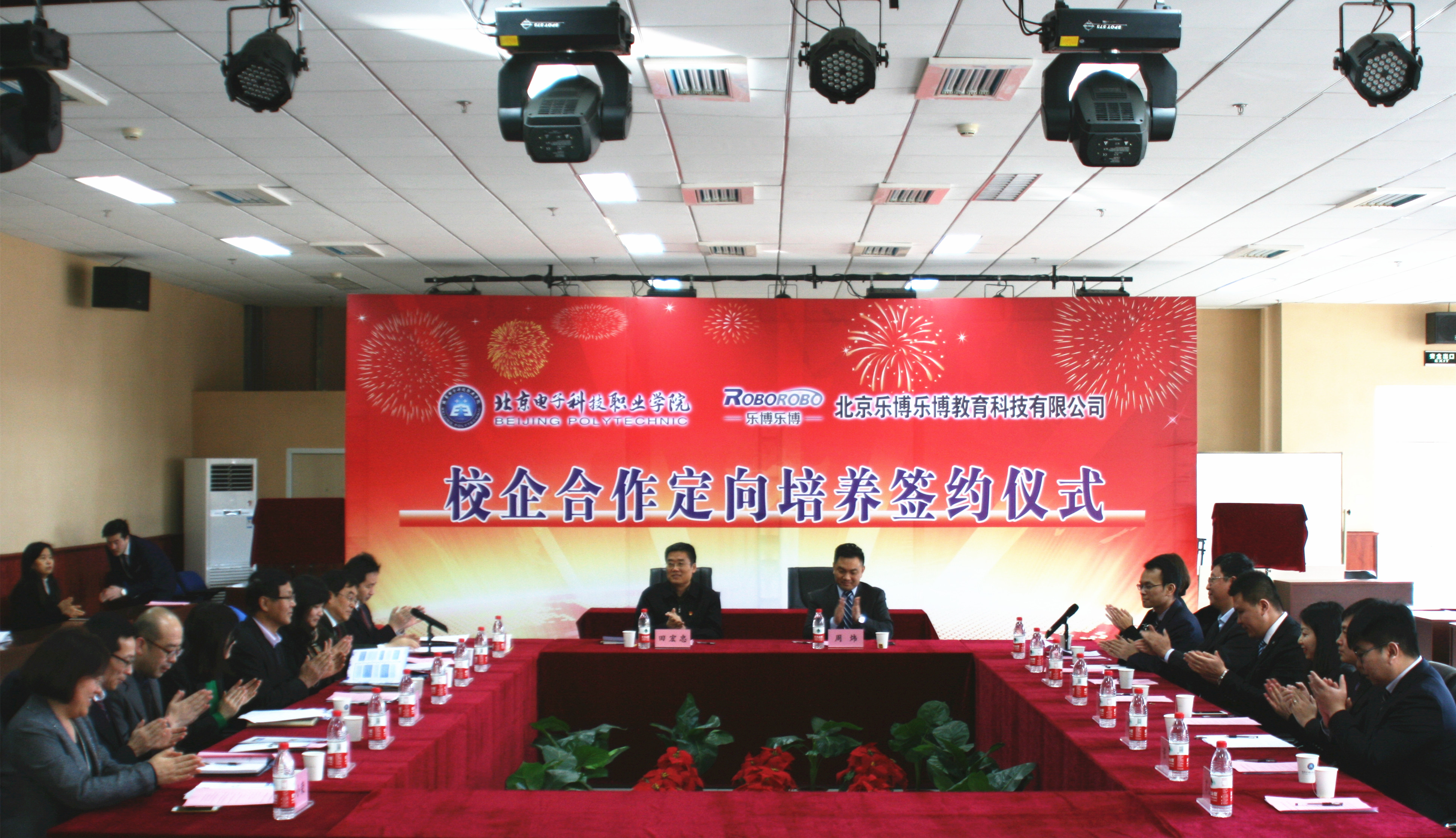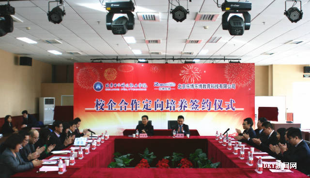签约仪式由招生就业处处长陶云明主持,会议在隆重热烈的气氛中进行。按照会议议程,校企双方分别介绍了参会嘉宾及双方简单情况。陶云明宣读了校企合作的主要内容。随后,副院长田宏忠和乐博乐博总裁周炜代表校企双方签署了合作协议、对合作牌匾揭牌并合影留念。