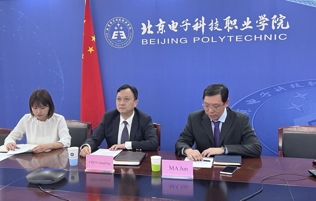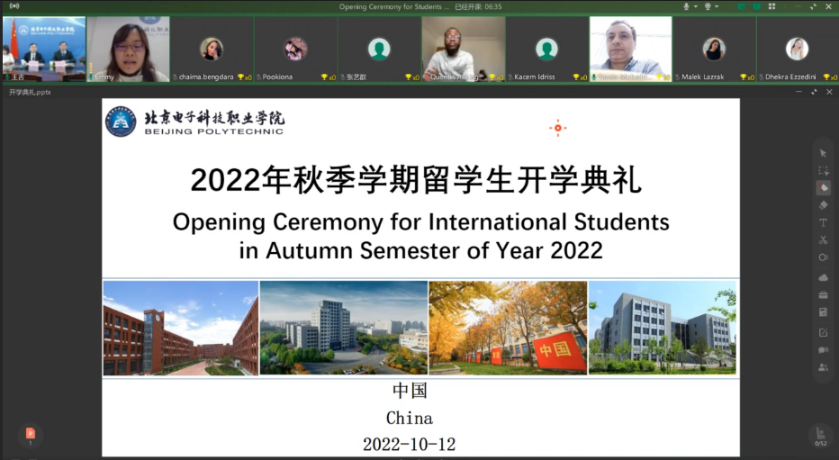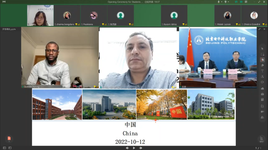 On the afternoon of October 12,Beijing Polytechnic held the Autumn opening ceremony for students of year 2022 in Tunisian Branch of Overseas Technical Skill Training Base online.Chen Jiangfeng,Vice President of Beijing Polytechnic,Professor Mokaddem Yassin of University Liberty of Tunisia,staff of the International Office, and all freshmenas well as teacher representatives attended the opening ceremony. The opening ceremony was presided over by Ma Jun from the International Office.