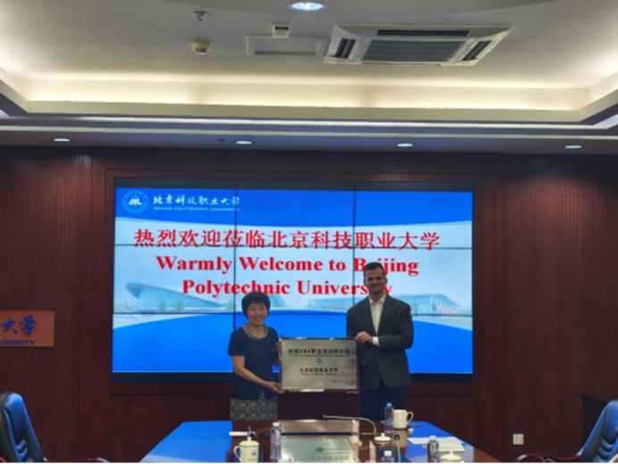 6月19日上午,德国职业教育代表团一行在德国联邦企业职业培训师协会副会长、柏林BBW应用科学大学教授诺曼·霍尔茨的带领下访问BEAT365,并举行"德国DBA职业培训师学院"授牌仪式。副校长辛秀兰接待了代表团一行。