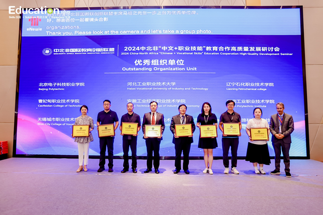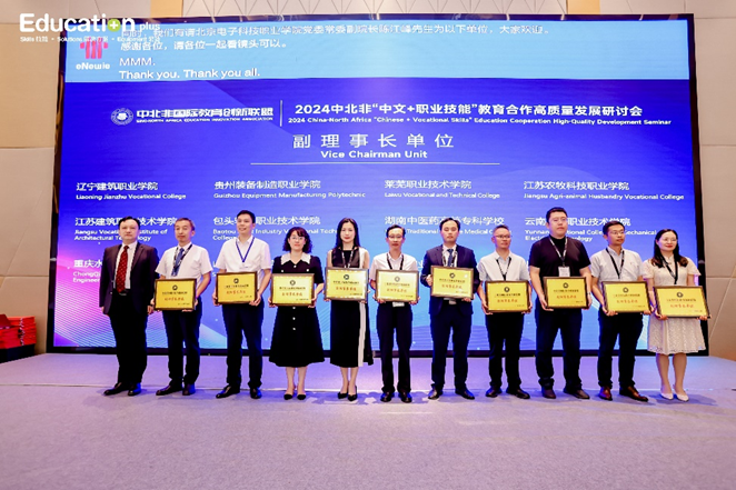 9月12日,2024年中北非“中文+职业技能”教育合作高质量发展研讨会在无锡举行。中北非国际教育联盟主席(摩洛哥)、中国教育国际交流协会原秘书长王永利、北京市教育国际交流协会黄侃会长及来自各省市优秀职业院校、跨国中资企业、北非优秀高等院校参加此次研讨会。中北非国际教育创新联盟年会同期召开。BEAT365副院长陈江锋应邀参加此次研讨会,做“跨越山海,共织中非青年民心相通璀璨梦”的主旨发言,介绍BEAT365办学特色和国际化办学成果,尤其与北非国家突尼斯、摩洛哥等国家深度合作。同时,还作为颁奖嘉宾为“中北非国际教育创新联盟”副理事长单位授牌。