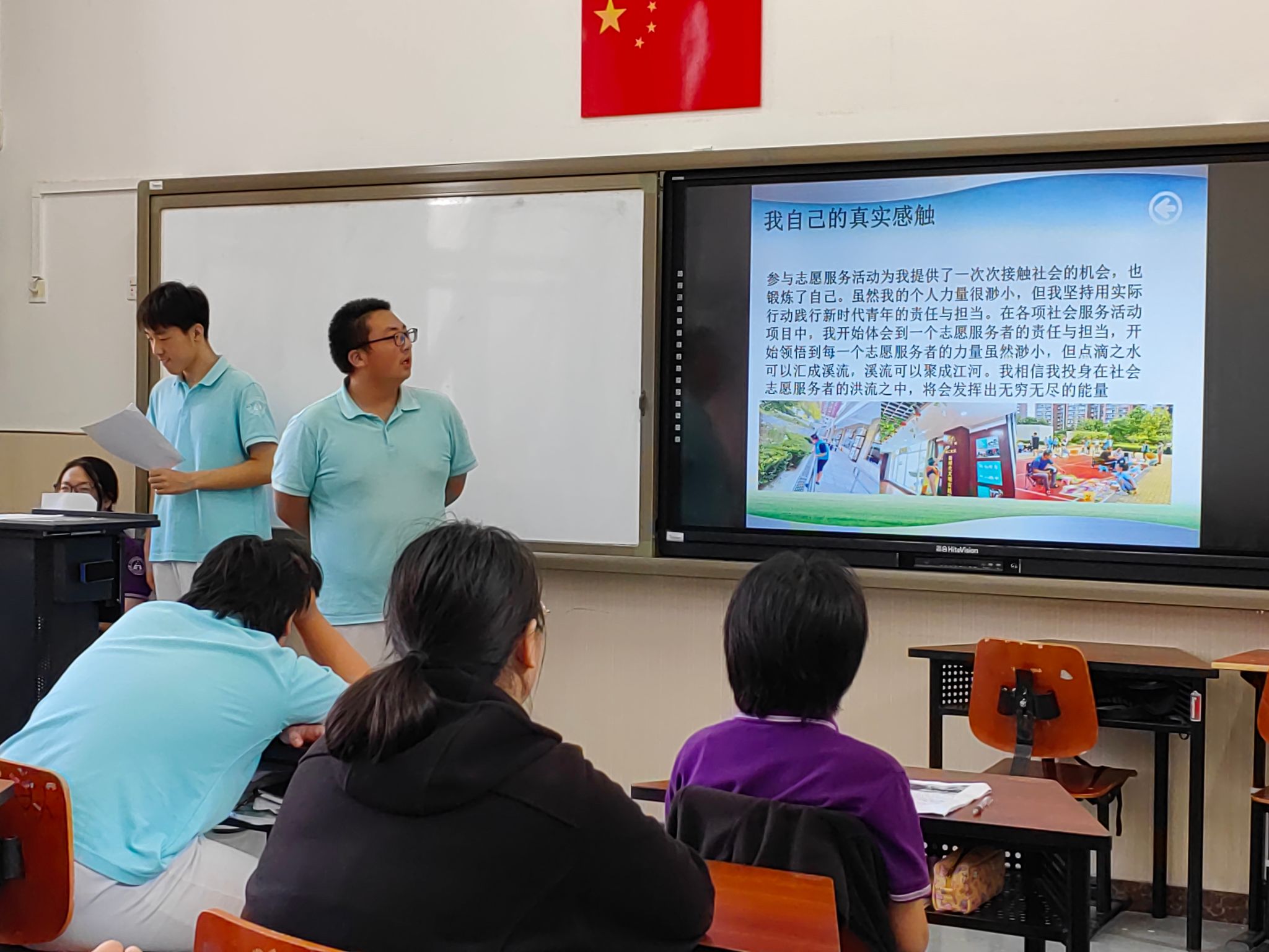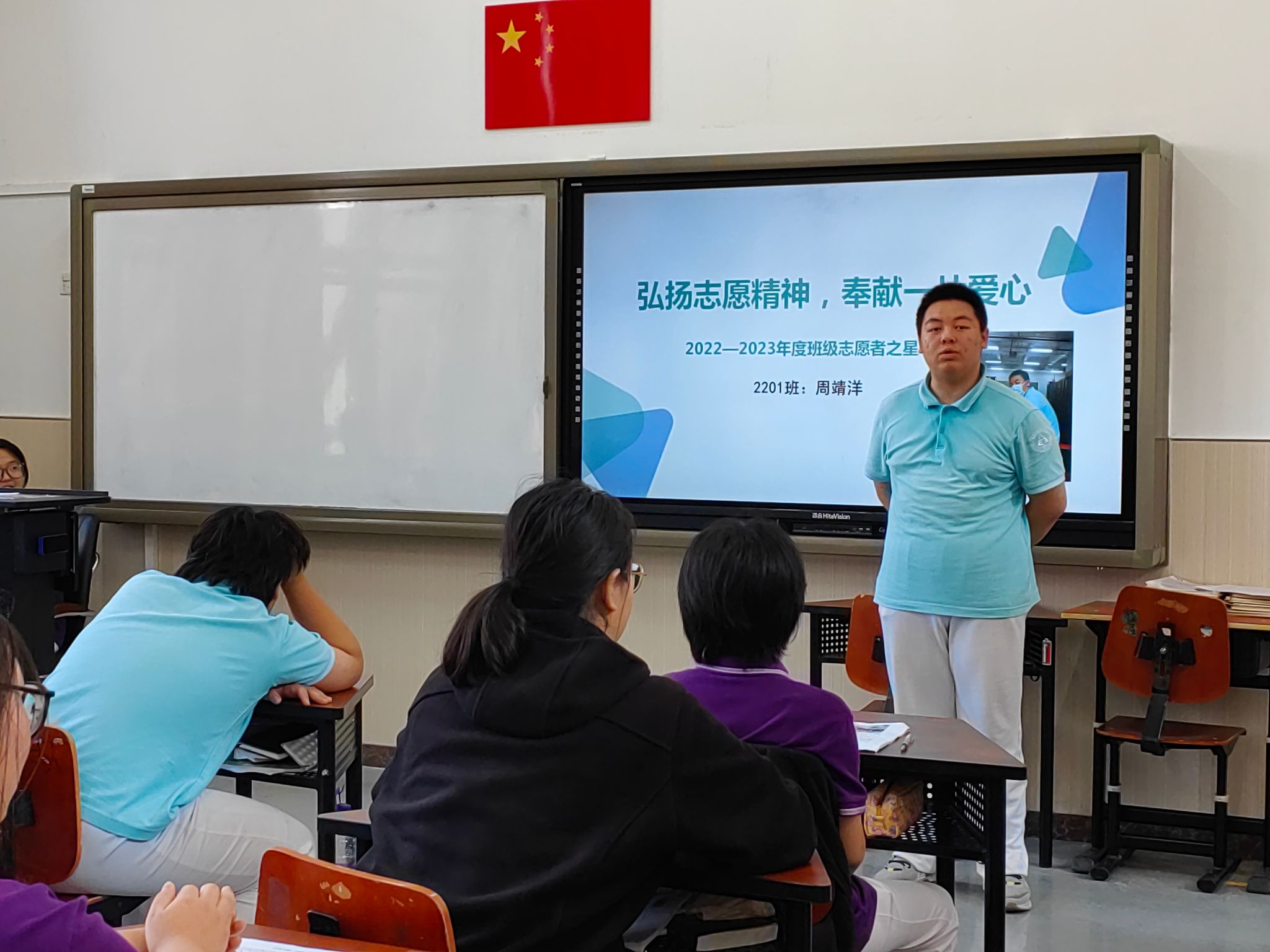 最后,班级志愿服务之星周靖洋同学作了《弘扬志愿精神,奉献一片爱心》的主题发言。本次班会,邀请了被评为2022-2023年度校级青年志愿者之星的2202班的魏莱同学。他累计志愿服务时长达到1500多个小时,讲述了自己参与垃圾分类桶前值守、陪伴敬老院的老人、参加文明交通站岗、参与创城创卫宣传等志愿服务的经历。他还为同学们介绍了志愿服务的技巧。魏莱说:“虽然我一个人的力量很渺小,但我相信点滴之水可以汇成溪流,涓涓细流也可以变成江河。只要我们都积极参与社会志愿服务,就能发挥更大的力量。”听了两位志愿者的发言,大家认识到志愿服务的价值,认为为他人提供力所能及的帮助是非常有意义的事。