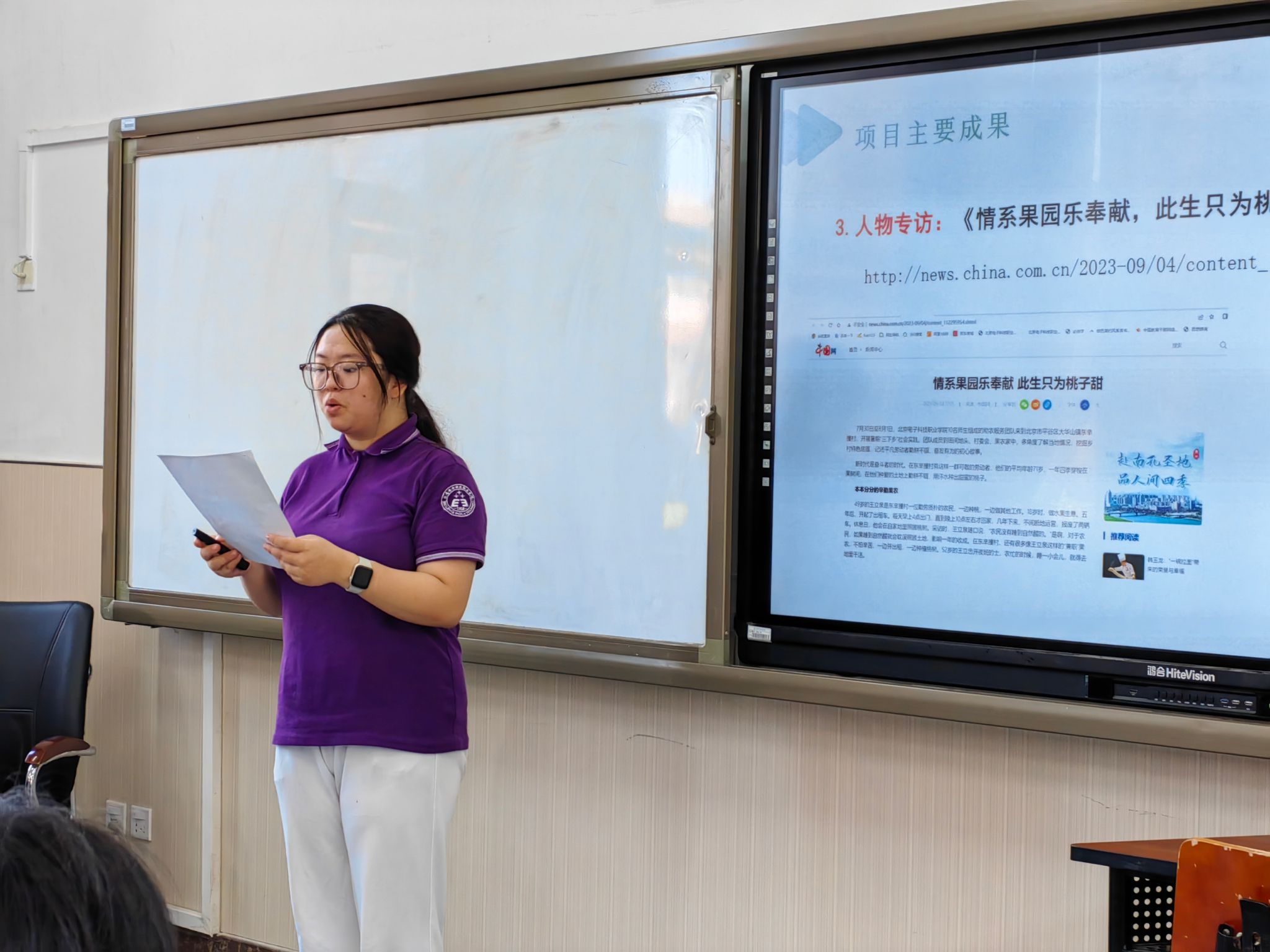 马鑫洋同学为大家朗读了中国网报道的由队员们撰写的人物采访纪实《情系果园乐奉献,此生只为桃子甜》。宋文杰、张米佳、靳东俊、王宝文、李嘉煜五位同学讲述了自己参与果园劳动、学习农事、参观村史展、采访村书记和果农、开展网络调研以及制作助农宣传片的感受。听了五位队员的发言,大家了解了平谷大桃产业的发展,以及桃子的种植过程,更加敬佩那些钟爱土地、勤耕不辍的平凡劳动者。