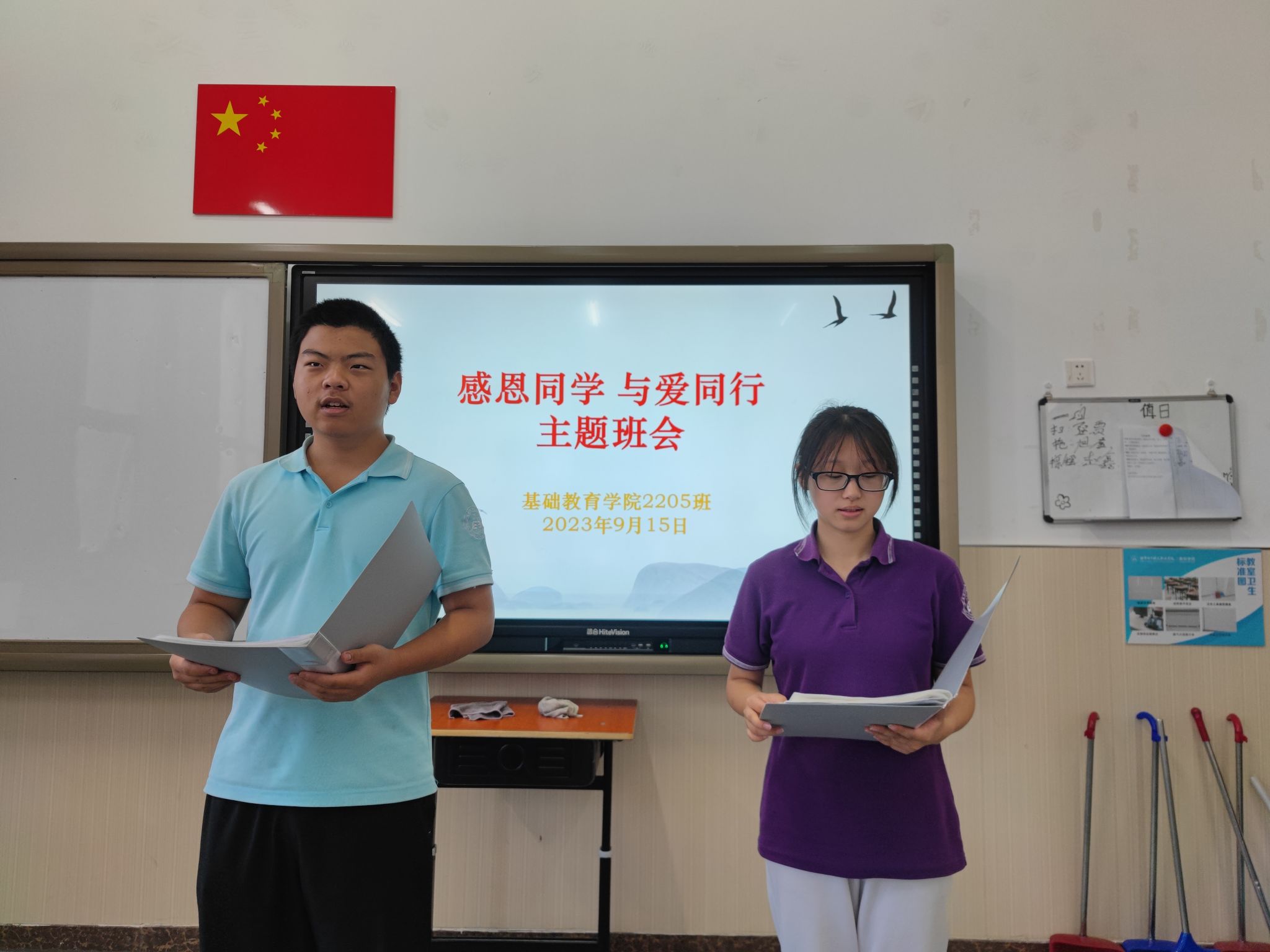 9月15日,基础教育学院2205班召开“感恩同学,与爱同行”主题班会。