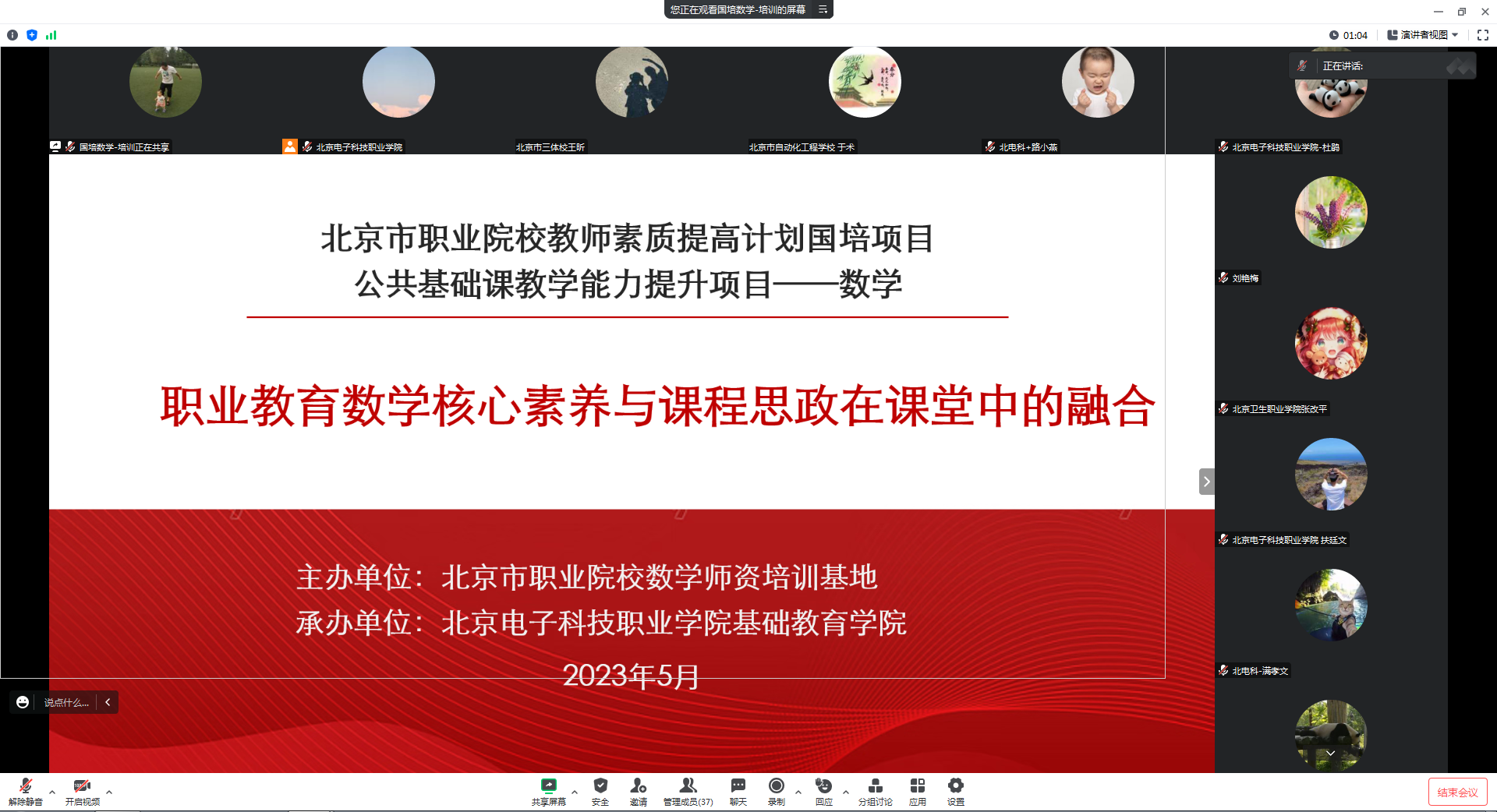 为深入学习贯彻习近平总书记关于教育的重要论述和全国职业教育大会精神,落实《关于实施职业院校教师素质提高计划(2021-2025)的通知》要求和北京市职业教育工作会精神,提高教师立德树人工作水平,强化数学教师课程思政教学设计和实施能力,促进师德师风建设,5月26日至28日,北京电子科技职业学院基础教育学院依托“北京市职业院校教师素质提高计划国培项目—公共基础课教学能力提升项目(数学)”举办职业教育数学核心素养与课程思政在课堂中的融合培训。培训采用线上线下相结合的方式,总参训人数达400人次。