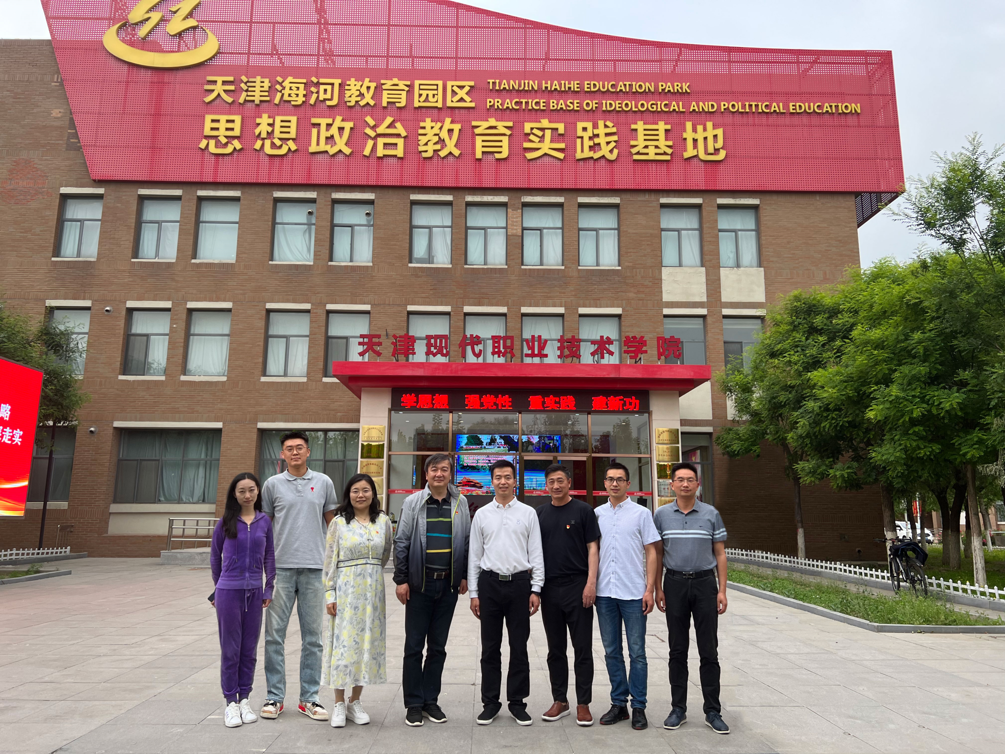 天津现代职业技术学院成立于2001年,是一所公办全日制高职院校,是中国特色高水平重点专业群(A档)建设单位、国家优质高职院校、国家示范性骨干高职院校(优秀)和国家首批现代学徒制试点单位。调研团队首先参观了位于该校的天津海河教育园区思想政治教育实践基地。基地占地面积5000平方米,包括了“新时代、新思想”“沿红路、寻初心”“明明德、晓律法”“立匠心、育匠人”四个部分,通过多媒体展示、VR互动体验、环幕放映、与机器人对话等形式,展示包括新时代重大成就、革命历史、道德与法律、工匠精神、中国各省风土人情等内容,创新思想政治教育与学生体验深度融合的“沉浸式”实践育人模式,让学生在情绪渲染、情感激发过程中深化认识和理解,使思想政治教育更加有理、有情、有趣、入脑、入心。