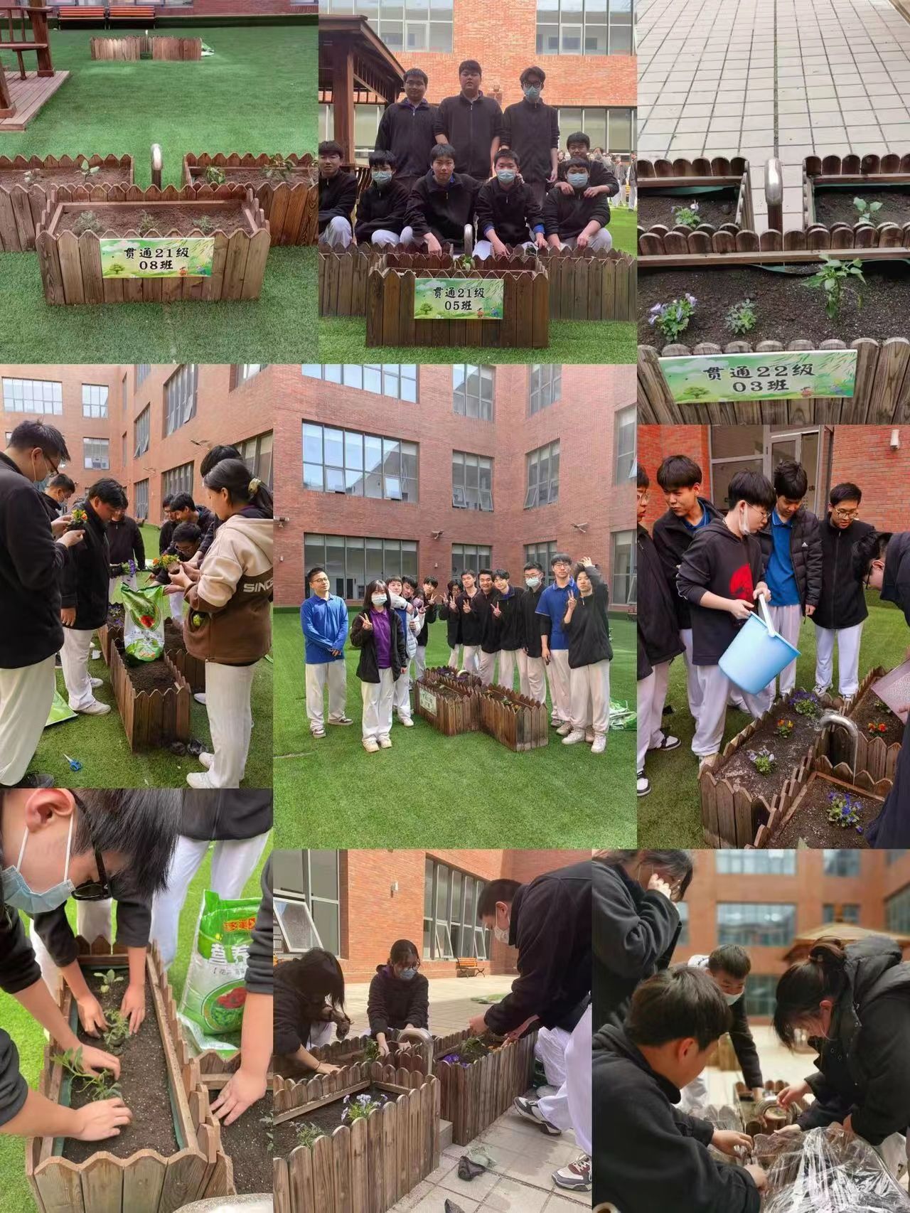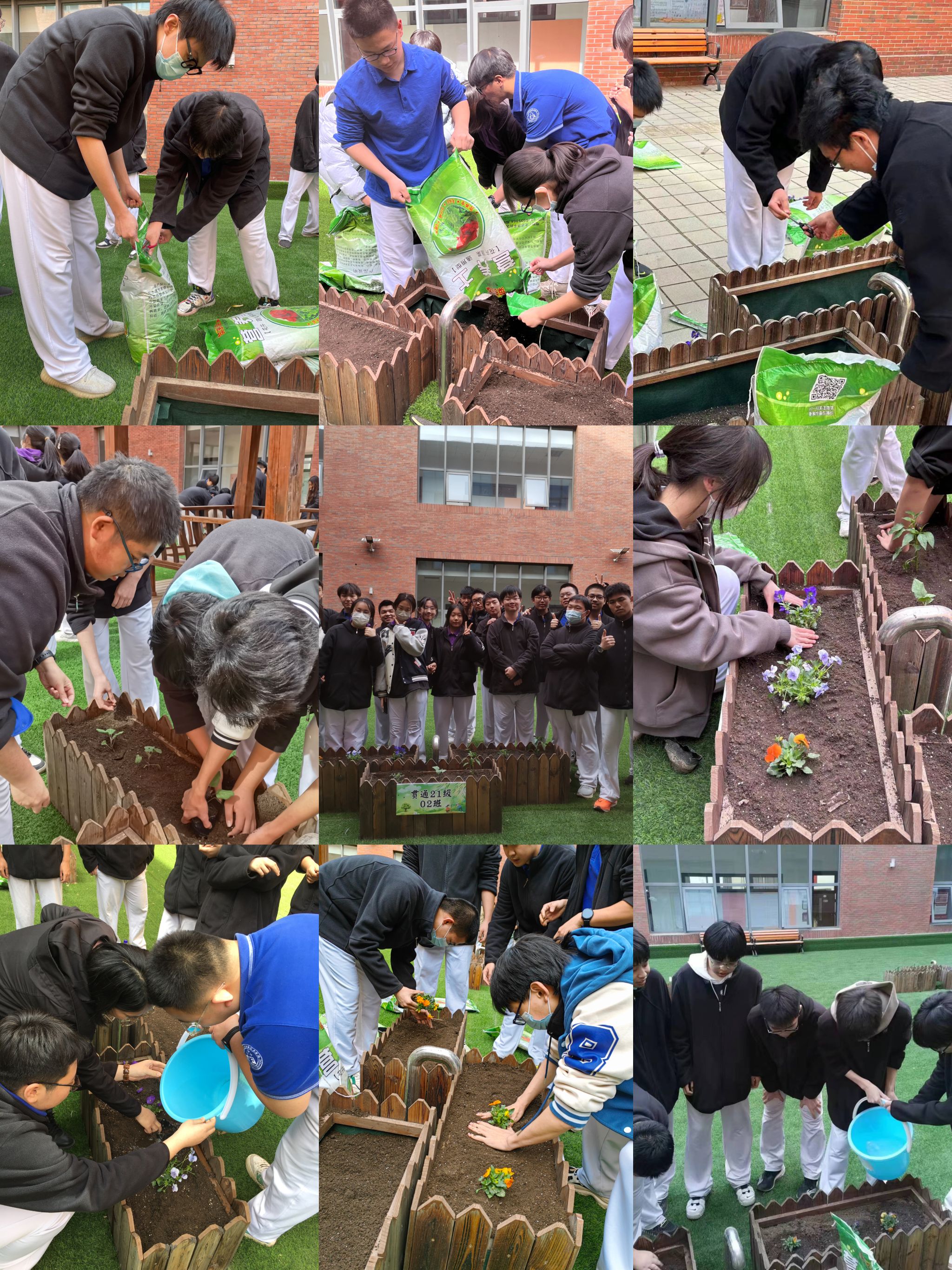 学院统一规划将教学楼二层平台上木栅栏划定区域给各班,分发营养土、花苗、果苗等物品供各班种植使用。3月16至17日,各班组织学习并种植植物、记录劳动感受。同学们分工把花苗、果苗拿到规定的种植地点,将土壤倒进花盆里并整理平整,再把苗种在土里。搬土、倒土、铺平、种植、浇水......,在班主任老师的组织下每个同学都有自己的任务,整个过程井然有序、配合默契。22级02班的郑润康是负责栽苗的同学,他用小铲子把土翻了几遍,让土变松软,便于辣椒的根有足够的生长空间,接着从土的中间挖出一排小沟,把辣椒苗插在小沟里,然后用土把小沟填平,再扎几个小孔,帮助种子透气,最后给它们浇水,这样辣椒种植就完成了。有的班级还给花苗、果苗自建“温室”,预防极端天气。