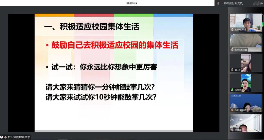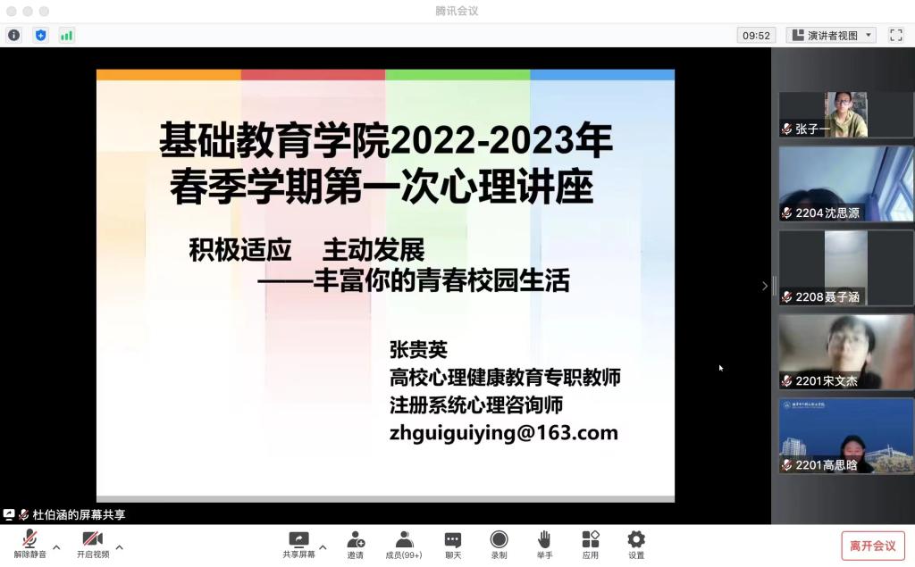 为上好新学期“心理健康教育第一课”,针对学生在后疫情时代回归常态化校园学习生活和集体生活的适应性问题、青春期心理健康与自我调适问题、人际关系冲突与自我情绪管控问题,3月11日,基础教育学院组织举办2022–2023学年春季学期第一次心理讲座。讲座邀请北京师范大学心理学专业,拥有18年心理健康教育、咨询和培训工作经历的张贵英老师,以“积极适应,主动发展”为主题展开讲座。基础教育学院全体学生、学生家长和班主任参加培训。