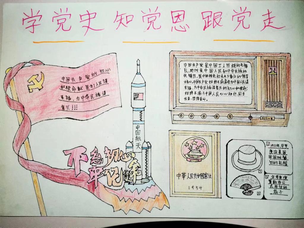 参观过后,同学们百感交集,久久不能平静,将所思所悟用画笔展示,以手抄报的形式在班级里分享。李承岳同学说:“经过这次的参观,我们进一步了解党带领广大人民群众艰苦奋斗的光辉历程,学习党史和革命先辈百折不挠、自强不息的精神,回顾历史,也让我们更加珍惜今天的幸福生活,不断增强热爱祖国、热爱人民、热爱中华民族的情感,激发了我们的爱国热情和责任担当。让我们争做新时代的创新型人才,为实现中华民族伟大复兴的中国梦而努力奋斗!”
