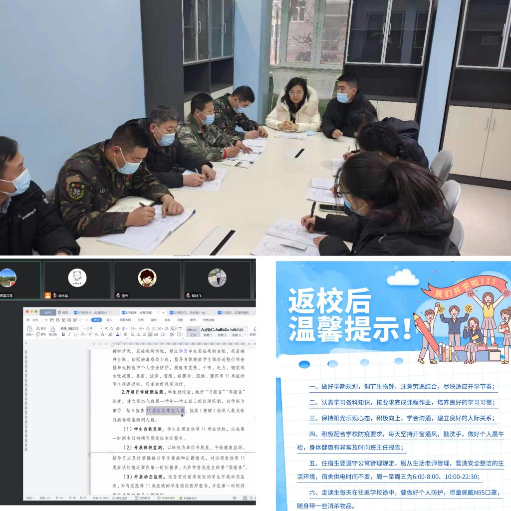 返校前,各班召开线上主题班会,第一时间传达学生返校工作的具体要求和注意事项,引导学生自2月10日起做好个人健康监测。2月18日,班主任全面摸排学生健康状况,统计返校报到人数。与此同时,学院精心布置温馨提示的宣传单和易拉宝,营造良好的开学氛围。