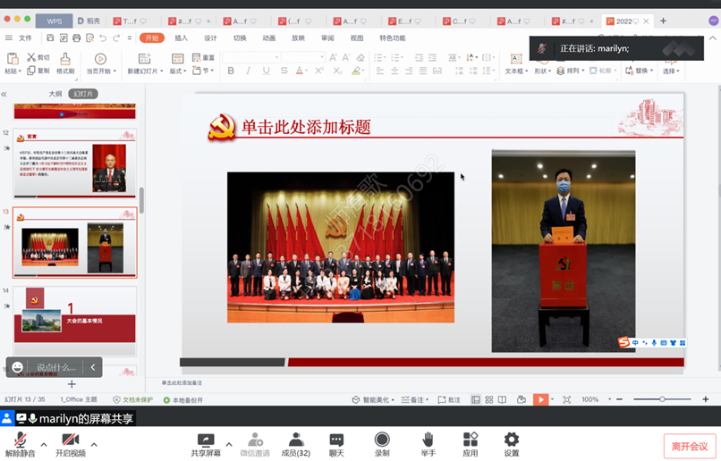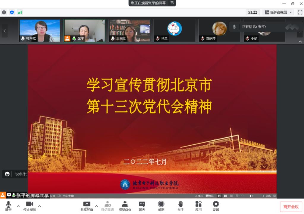 2022年7月8日下午,基础教育学院外语教学部党支部通过线上方式认真学习传达中国共产党北京市第十三次代表大会报告全文,支部书记张平老师领学。