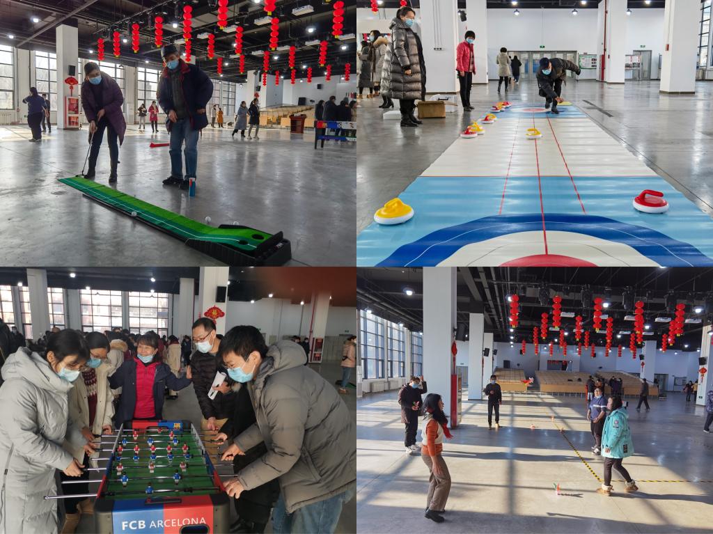 党总支书记、分工会主席董锋、院长王冬琳、党总支副书记王彦侠、副院长陈洪华向全体教职工拜年,新年团拜会在热烈的掌声中开始。工会干事精心布置了会场并准备了旱地冰壶、桌上足球、三子棋、齐心协力等游艺项目,营造了喜庆的氛围。大家纷纷围在旱地冰壶游艺项目旁,争先恐后地推着冰壶,时不时的传来惊呼和大笑;桌上足球游艺项目也是大家比较喜爱的,桌子旁围着7、8位老师,每人都紧握操作杆,瞪大眼睛盯足球,看他们的架势比在绿茵场上的运动员还要专注……整个会场里回响着大家的欢笑声、叫好声,好一片热闹的景象。