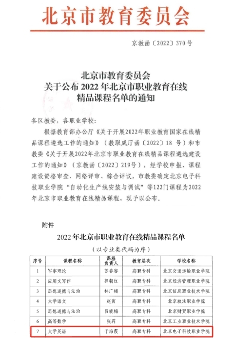 基础教育学院外语教学部《大学英语》课程2022年获评北京市职业教育在线精品课程。
