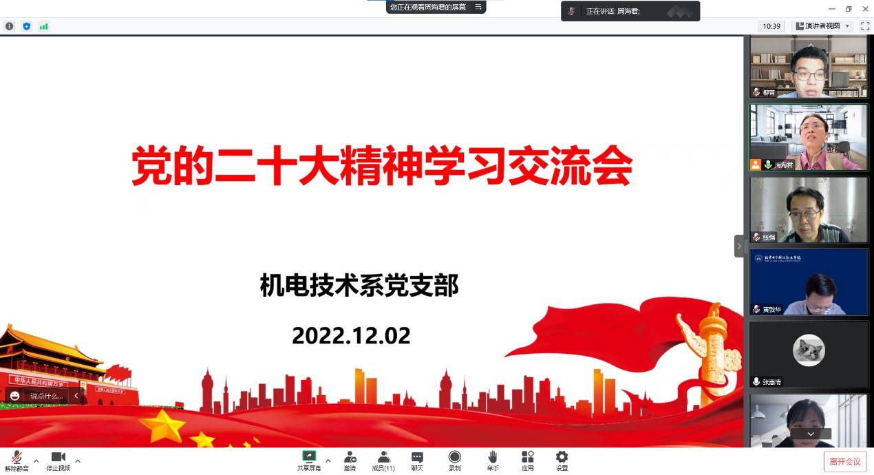 为了深入学习领会党的二十大精神,把党的二十大精神贯彻落实到教学育人全过程,2022年12月2日,机电工程学院机电技术系党支部开展了党的二十大精神学习交流会,会议由党支部书记周海君主持,机电技术系全体党员、教师参加会议,会议还邀请了学校关工委二十大精神宣讲组成员张惠清进行督学、宣讲。