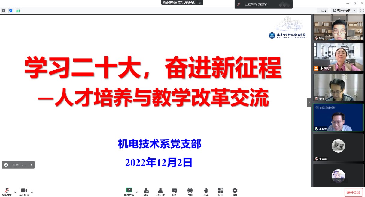 交流会分三个议程。首先,支部党员、机电工程学院副院长黄敦华以“学习二十大,奋进新征程—-人才培养与教学改革交流”为题做了主题发言。黄敦华从中共中央关于认真学习贯彻党的二十大精神的决定、教育部党组对教育系统深入学习宣传贯彻党的二十大精神作出部署安排、北京电子科技职业学院学习宣传贯彻党的二十大精神实施方案、机电工程学院人才培养与教学改革贯彻落实党的二十大精神四个层面分享了学习心得,分析了学院在人才培养、课程思政、教学改革和技能大赛等方面的思考。