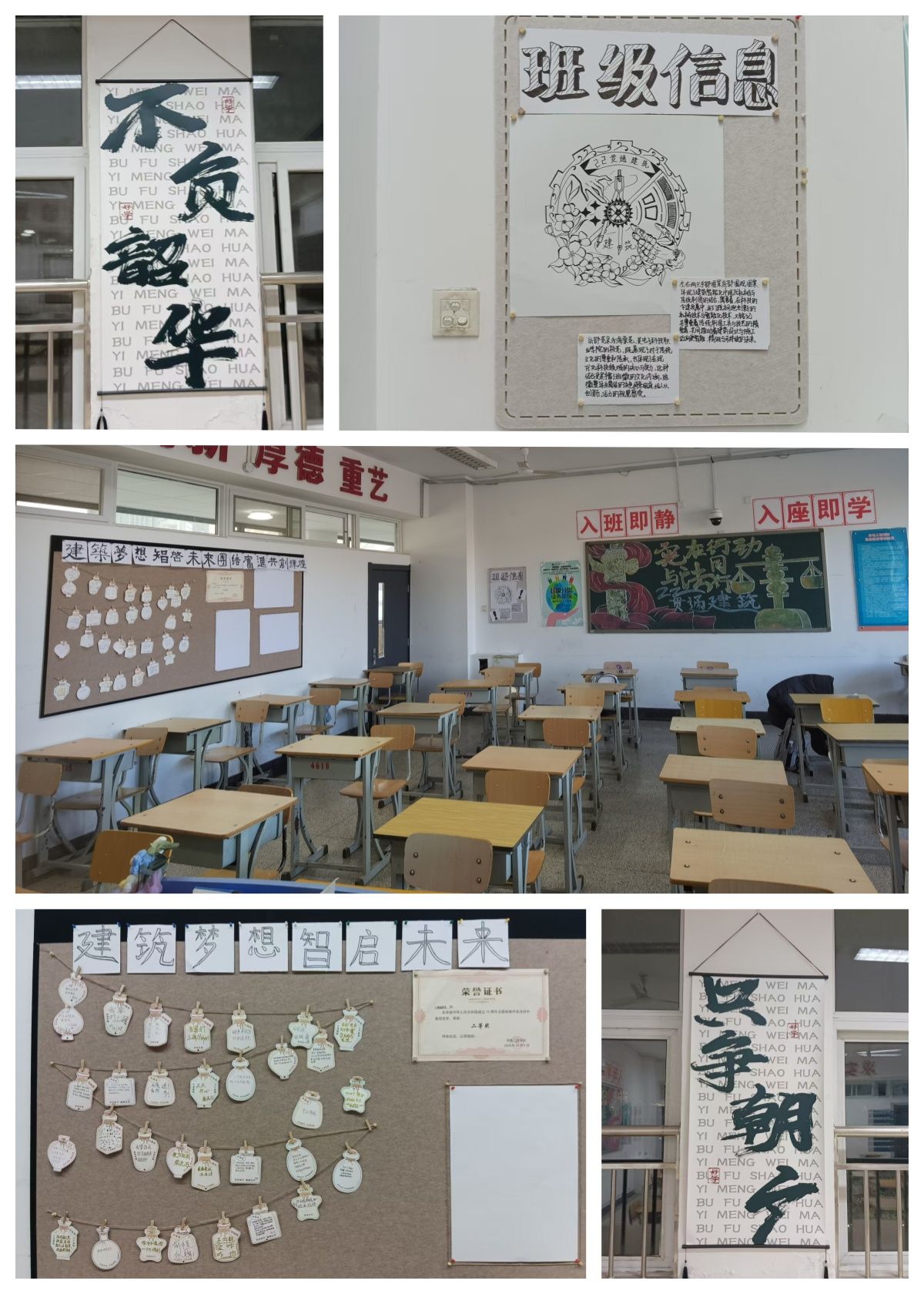 22贯通建筑班以“建筑梦想,智启未来,团结奋进,共创辉煌”为班级班训,体现了班级的共同愿景。“建筑梦想”意为班级成员怀揣着各自的理想,用心规划、构筑自己的未来蓝图;“智启未来”鼓励同学们以聪明才智为钥匙,开启通往美好未来的大门;“团结奋进”突出了团队协作的力量,携手并进,在追求卓越的道路上不懈努力;“共创辉煌”作为班级的共同目标,激励着每位成员为集体的荣耀而奋斗,创造出属于自己的辉煌成就。