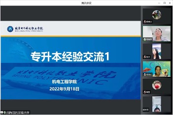 为了满足机电工程学院学生对转生本的学历提升需求,2022年9月18日,机电工程学院举行专升本经验交流分享会。邀请了今年顺利考入北京联合大学的四名优秀毕业生进行线上经验分享交流,来自机电工程学院21、20级有专升本意愿的六十余位学生、辅导员和班主任参加会议,会议由周海君老师主持。