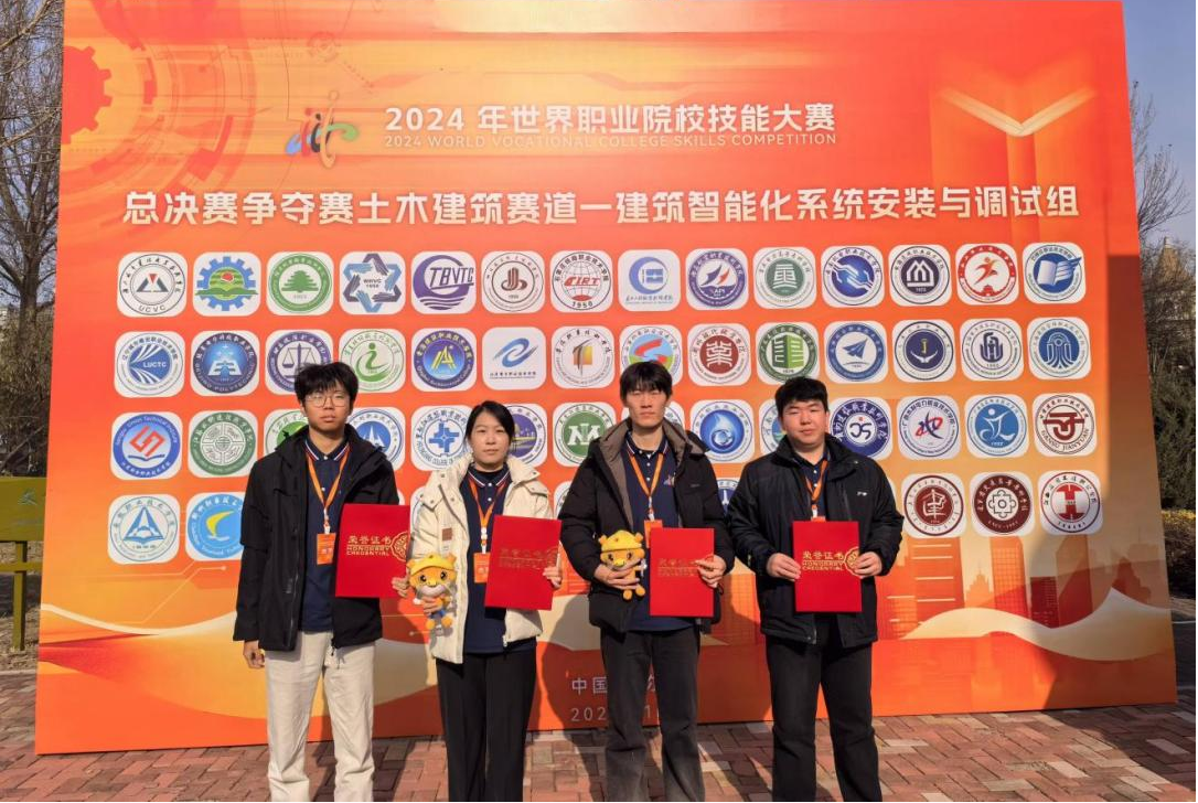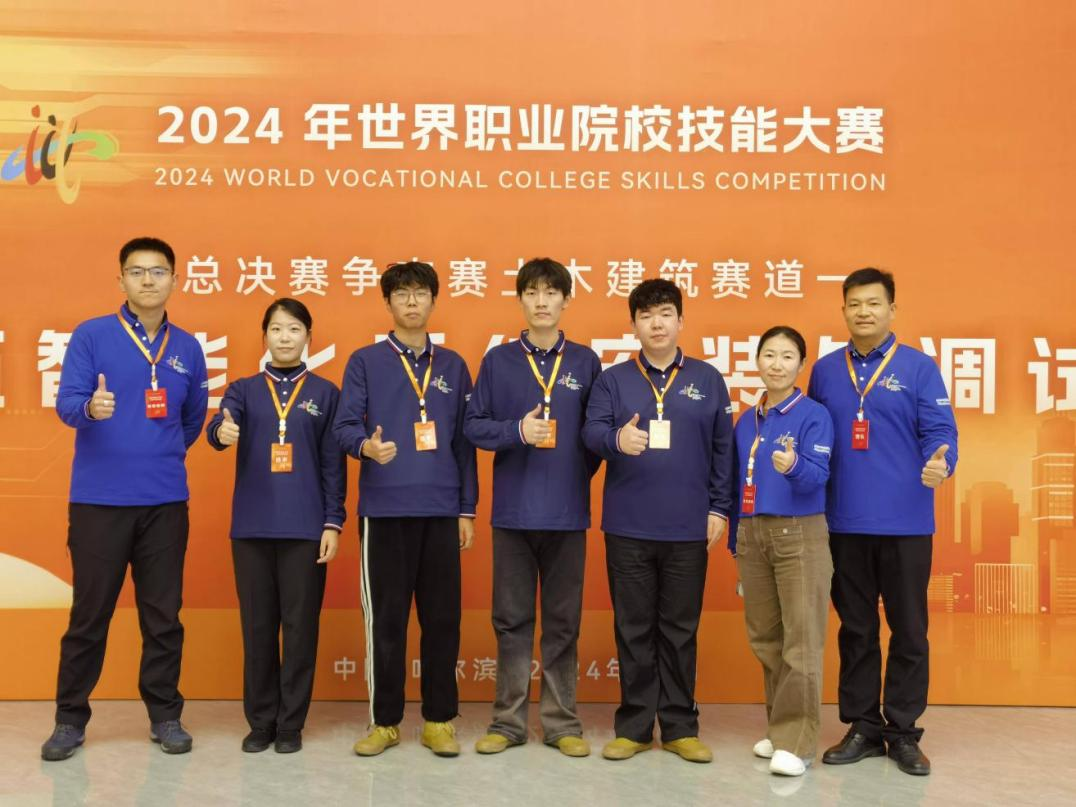 2024年10月28日至31日,2024年世界职业院校技能大赛总决赛争夺赛土木建筑赛道——“建筑智能化系统安装与调试”赛项在黑龙江建筑职业技术学院举行。机电工程学院张宇、苏董、李楠、申亚杰4名选手,在张莉莉、李雨航两位老师指导下,与来自全国56支参赛队伍激烈角逐,最终获该赛项铜奖。