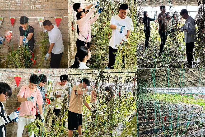 随后,同学们在孙哲和农场师傅的指导下,走进了农业大棚,摘西瓜,收拾瓜藤。大棚里闷热难耐,一不小心爬满藤架的瓜秧就会拉伤皮肤,同学们面对困难没有退缩,耐心解绳子、摘瓜秧、然后整理到棚外。农活并不复杂,老师和同学们一起动手,团结协做,一上午的时间,完成了半个大棚的收拾工作。