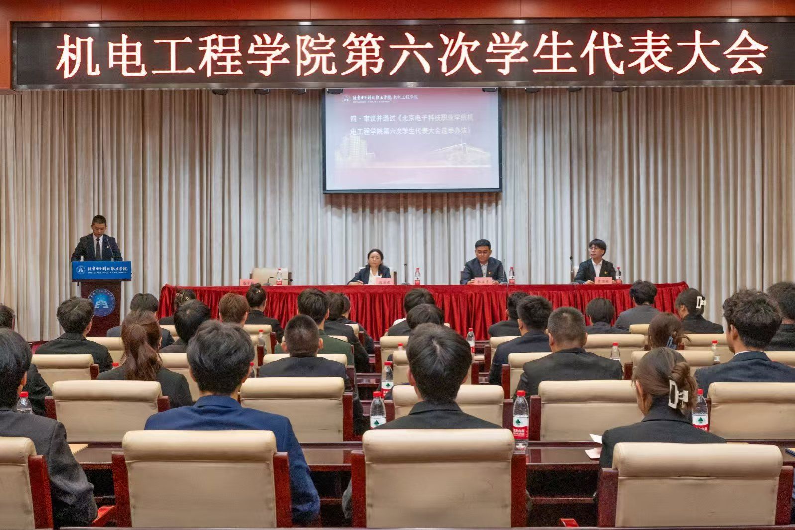大会审议并通过了《北京电子科技职业学院机电工程学院第六次学生代表大会选举办法》,新一届主席团候选人向代表们介绍了个人情况。经过全体代表无记名投票、严谨细致的监票计票后,大会宣布申亚杰、范洺硕、侯慧琳3名同学当选机电工程学院第六届学生会主席团成员。