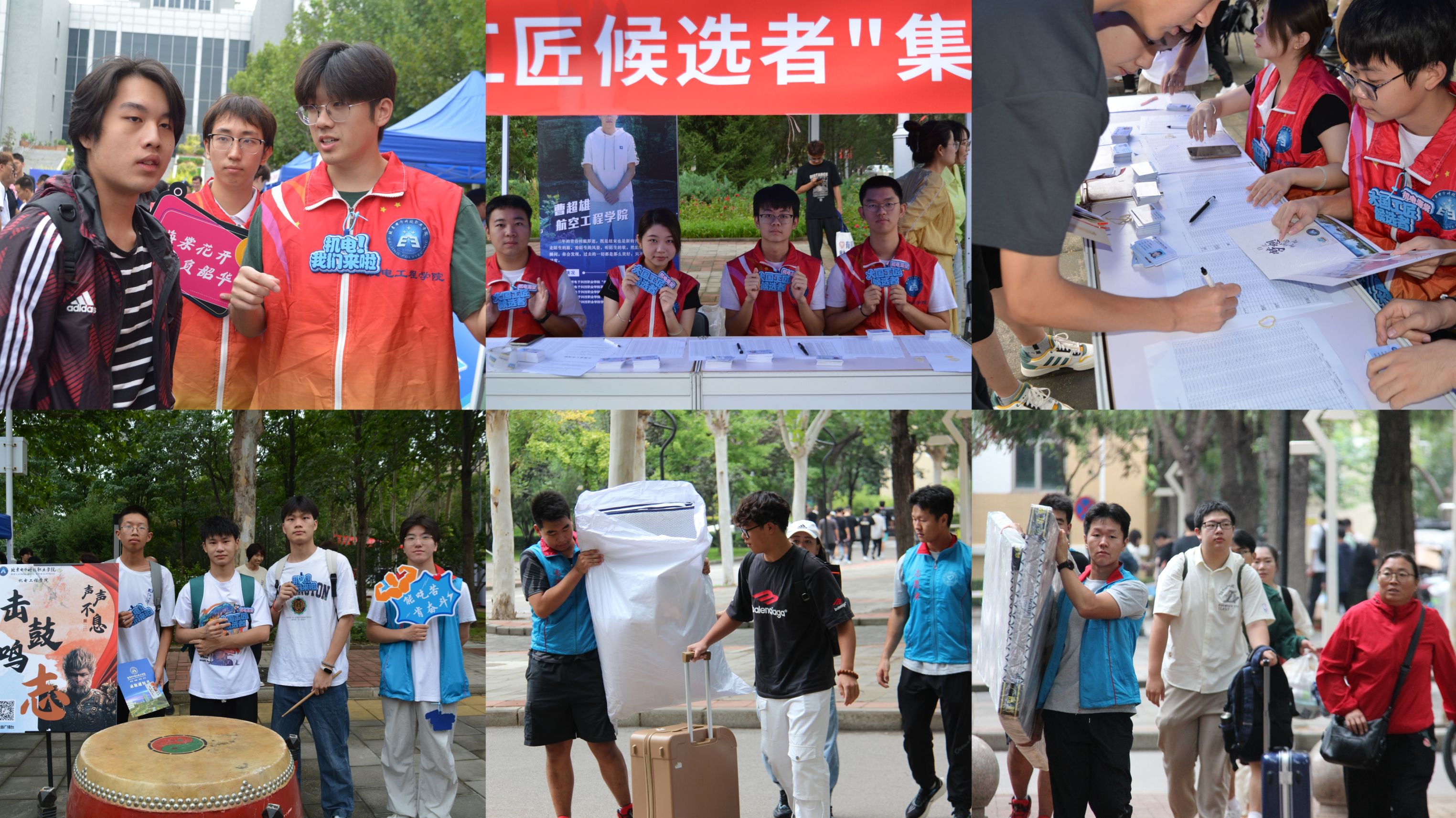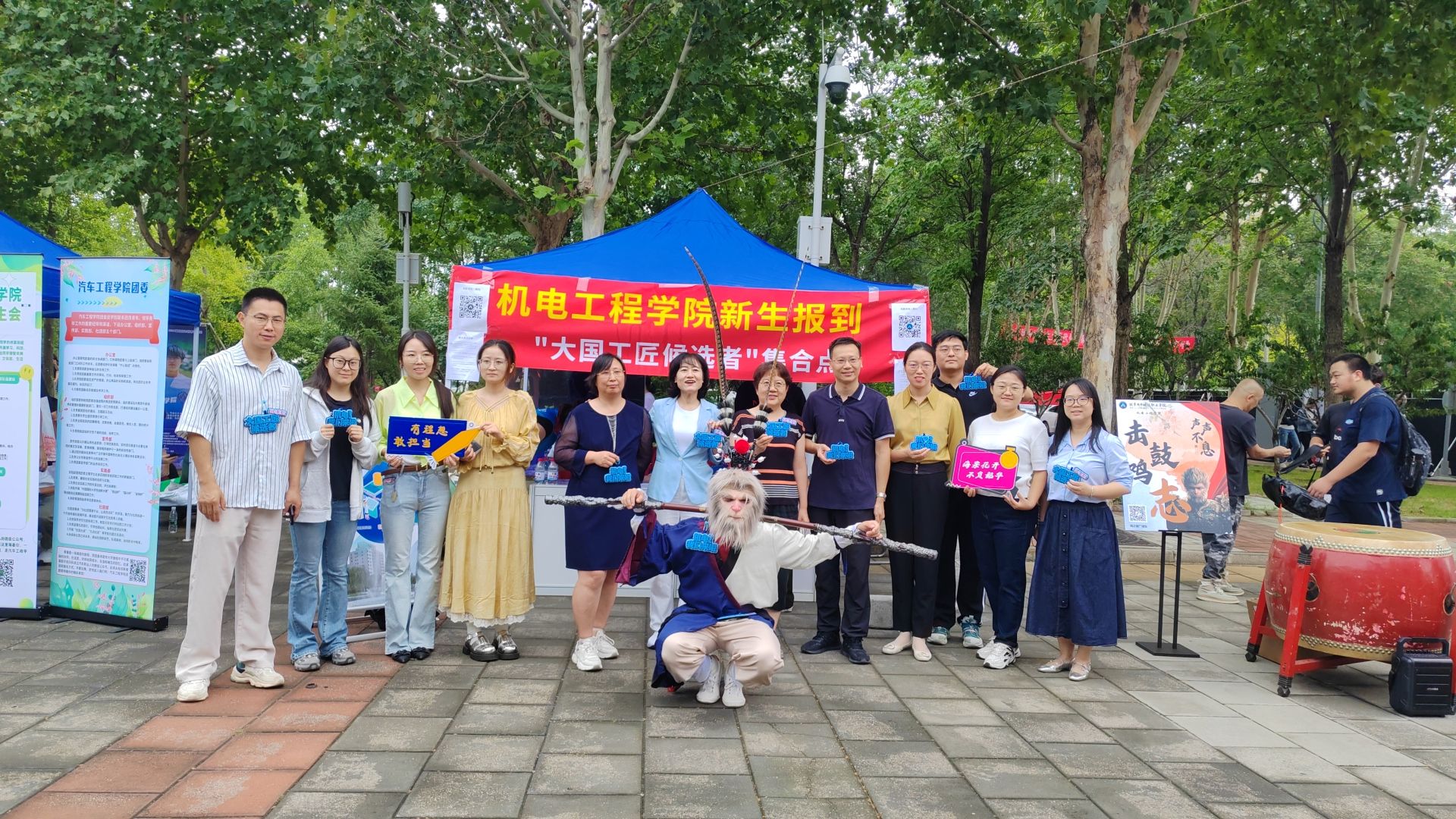 在迎新现场,全体班主任、辅导员、班级助理和志愿者们耐心指引,精细提醒,帮助同学们完成线上扫码、材料审核、校园卡发放、宿舍入住等各流程工作,新生报到井然有序。学院还策划了“击鼓明志”小活动,“齐天大圣”孙悟空扮相的学长神采飞扬,吸引同学们参与活动,一声声悠远的鼓声,蕴含着新生对未来的期待,体现了学院对新生们的鼓励。同学们纷纷合影,领取“大国工匠候选者”的文创伴手礼,现场氛围热烈。