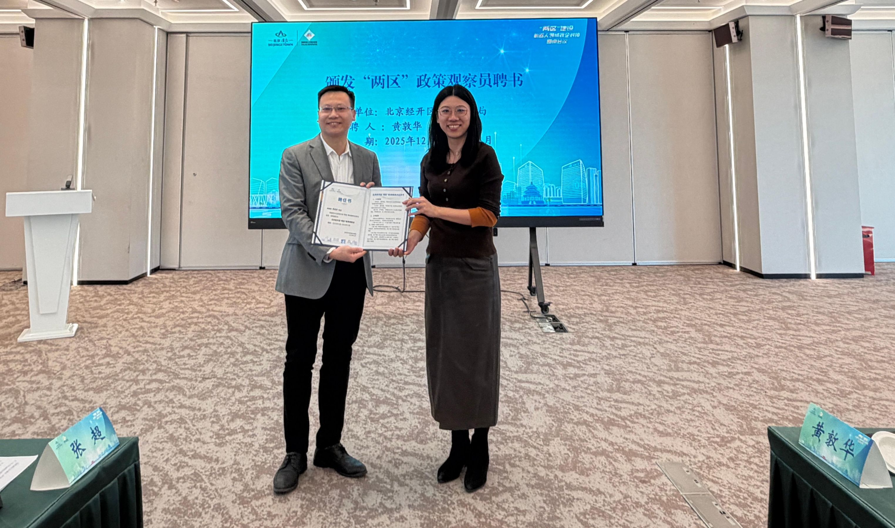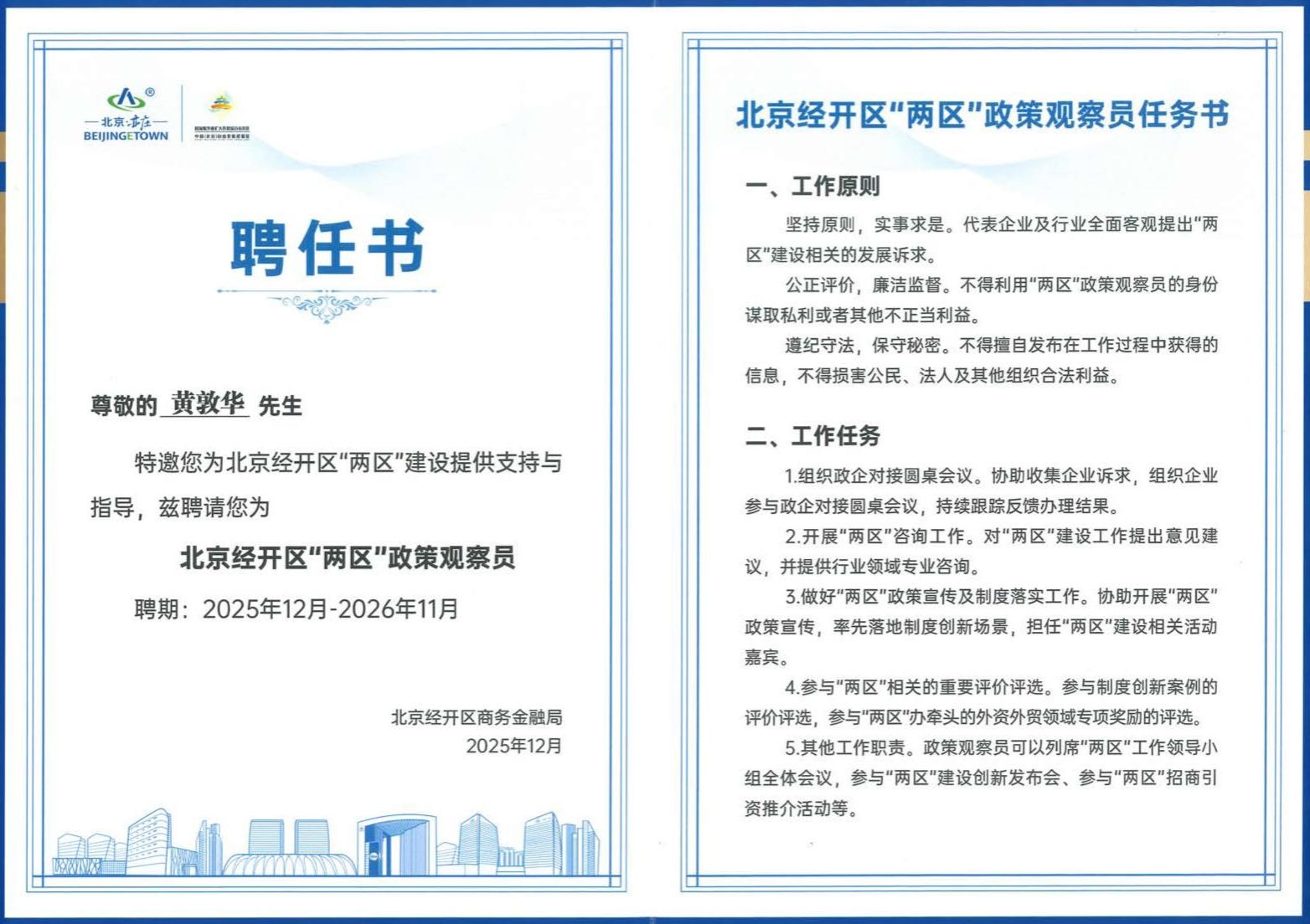 为发挥高校在“两区”建设过程中的智库作用,北京市经开区商务金融局聘请黄敦华担任“两区”政策观察员,并向其颁发证书。