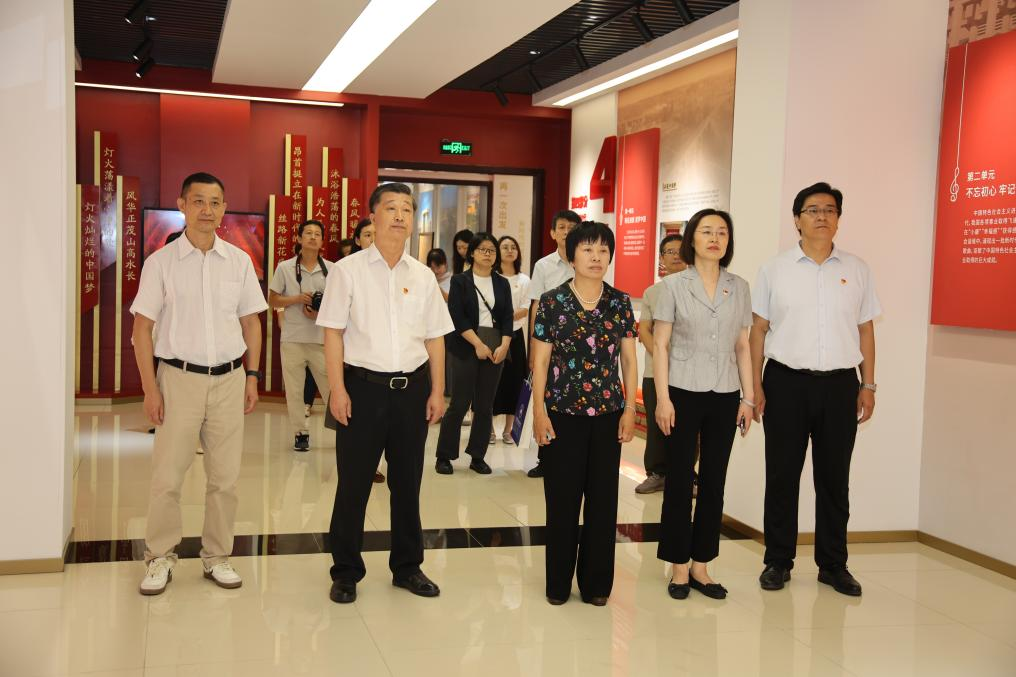 康井泉带领大家参观了“永恒的旋律——颂歌党的辉煌历程”主题展。展陈包含了颂歌烽火岁月、高歌火红年代、讴歌新时期及放歌新时代4部分12个单元主题内容,通过179张珍贵照片、103首经典歌曲、9个精美视频,生动展示了中国共产党在不同历史时期的发展脉络与伟大成就。在展区内,每至一处便有耳熟能详的经典歌曲响起,全体人员认真聆听讲解,不时交流讨论,深刻感悟中国共产党为国家富强、人民幸福作出的卓越贡献。