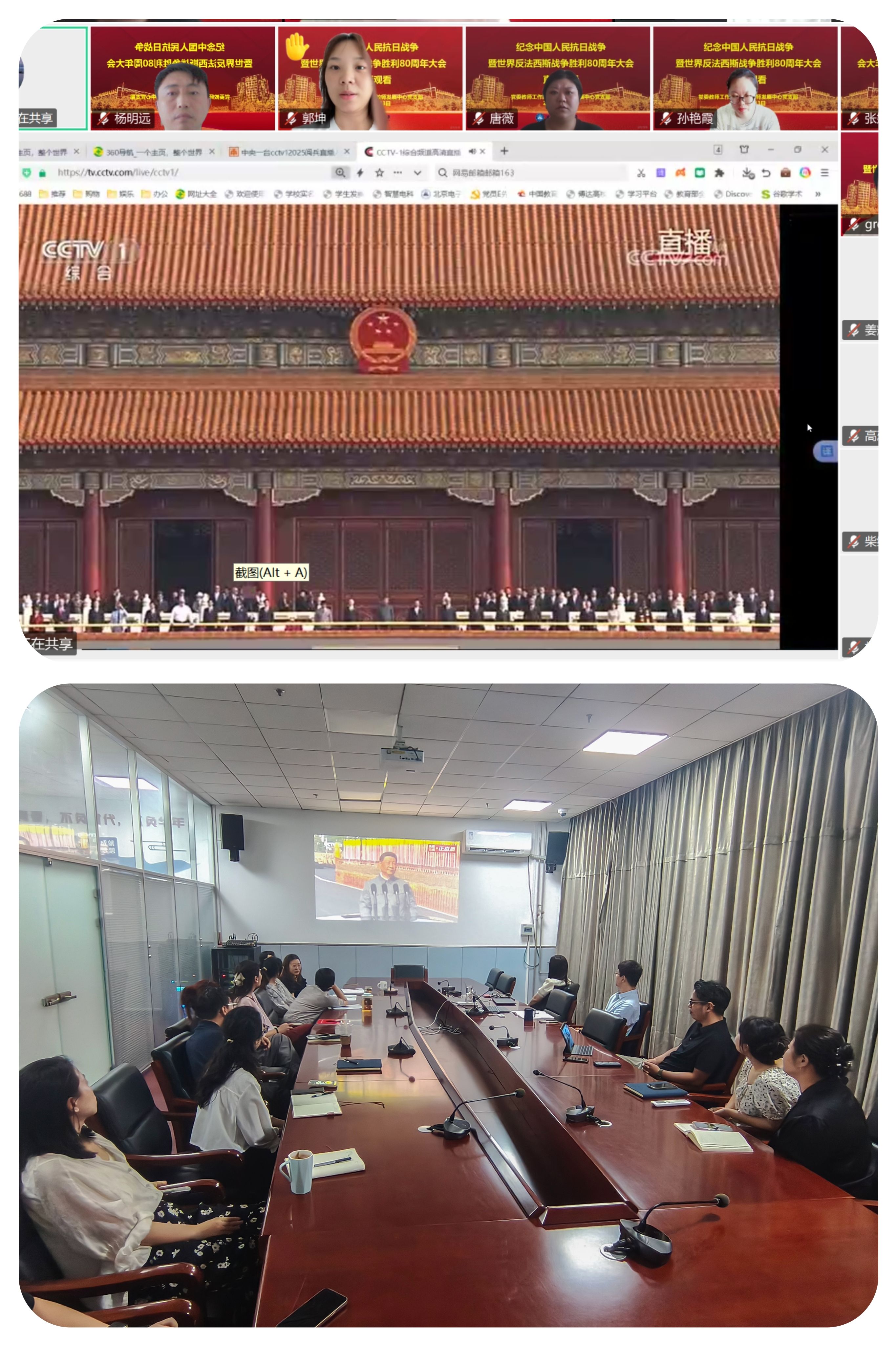 2025年9月3日上午,纪念中国人民抗日战争暨世界反法西斯战争胜利80周年大会在北京天安门广场隆重举行。机关教职工通过多种形式收听收看盛大阅兵仪式,共同见证这一承载历史记忆、彰显国家力量的庄严时刻。