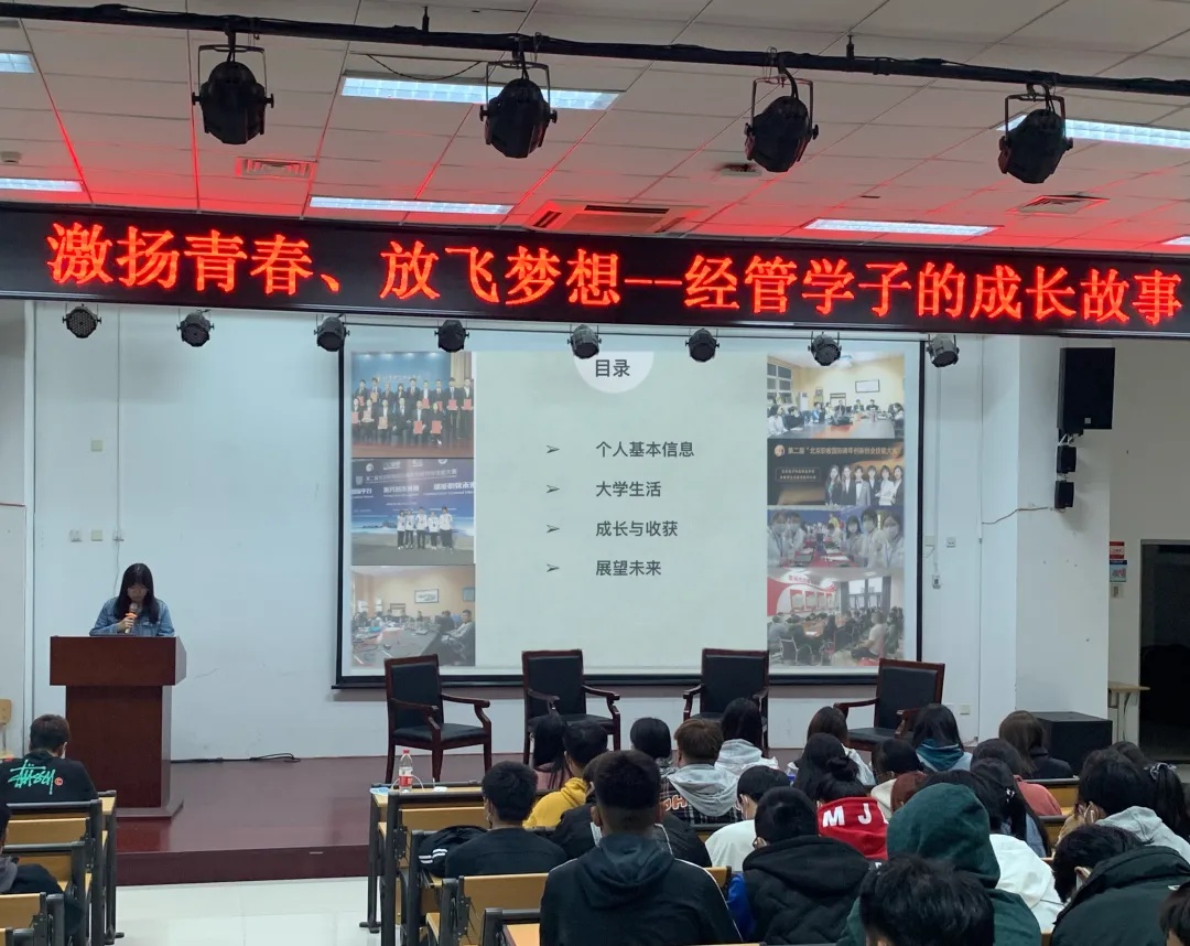 18电商毕业生王艺学给同学们讲述了她在大学期间的成长与收获,从“目标、眼界、努力、坚持、超越”五个方面展开深入讲解,并针对同学们的困惑做出了清晰明确的解答。特别是在学业、技能比赛和社团活动时间冲突的问题上,王艺学用自己的亲身经历告诉学弟学妹们,合理规划和利用时间,抓住重点进行突破,令同学们豁然开朗。