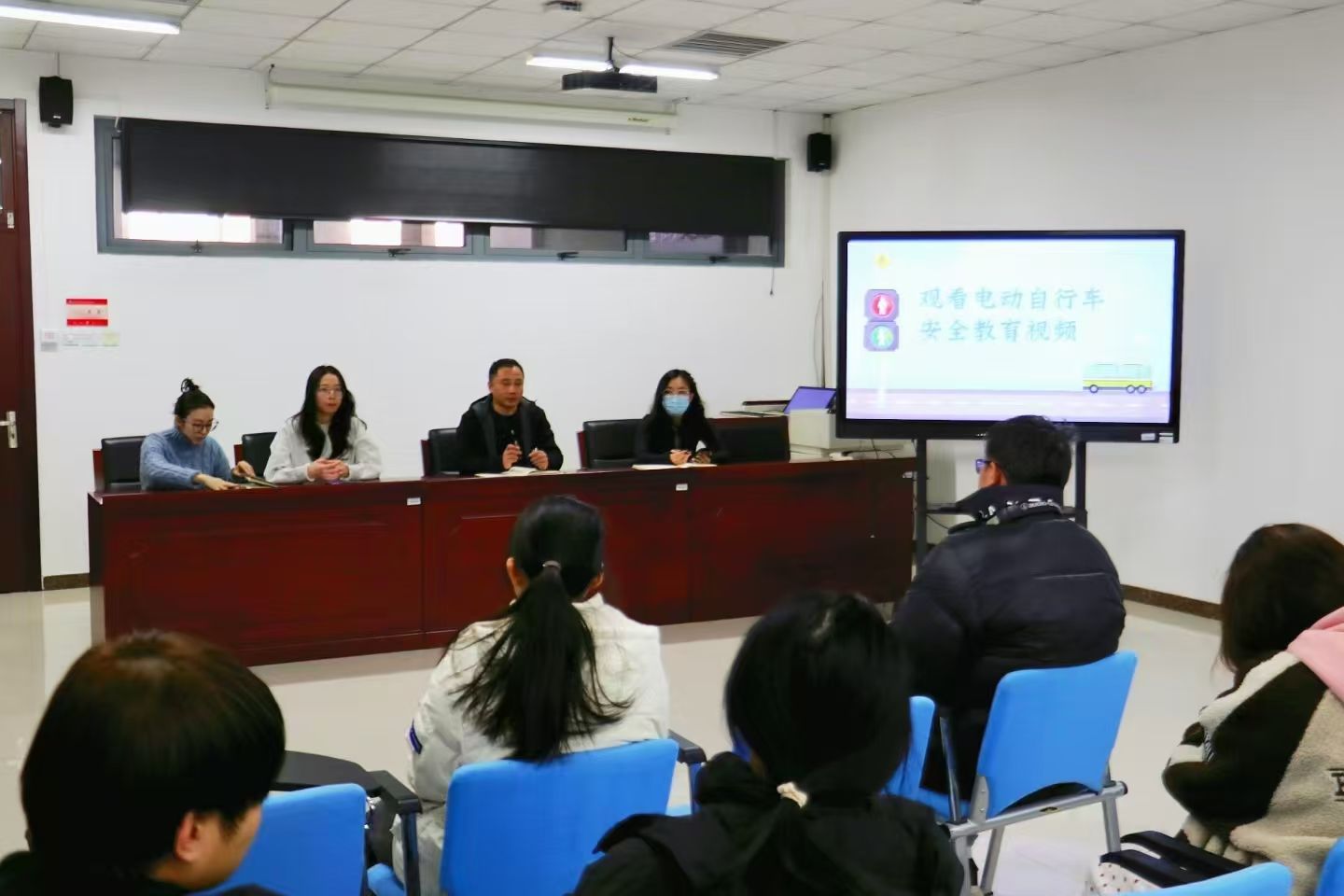 辅导员陶源为大家播放了电动车火灾及电动车安全使用指导短片。通过生动的案例和详细的讲解,科普了电动车安全使用的注意事项,警示提醒大家务必重视电动车使用规范。与会人员认真聆听,多位学生车主结合自身经历,就如何加强校园电动车安全管理、提高师生安全意识等方面发表了意见和建议。