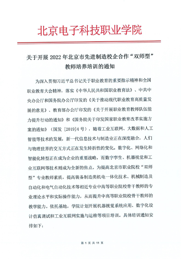 关于开展2022年北京市先进制造校企合作“双师型”教师培养培训的通知