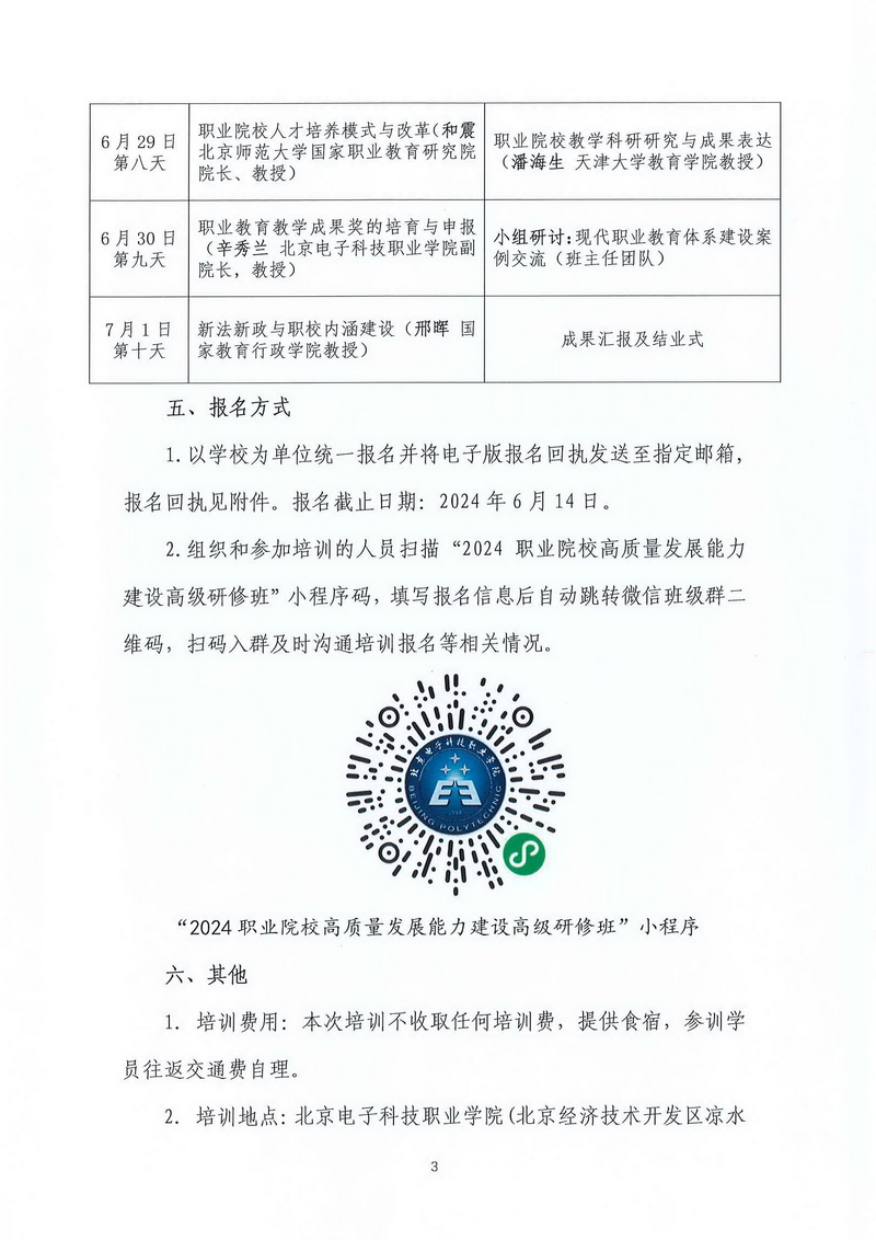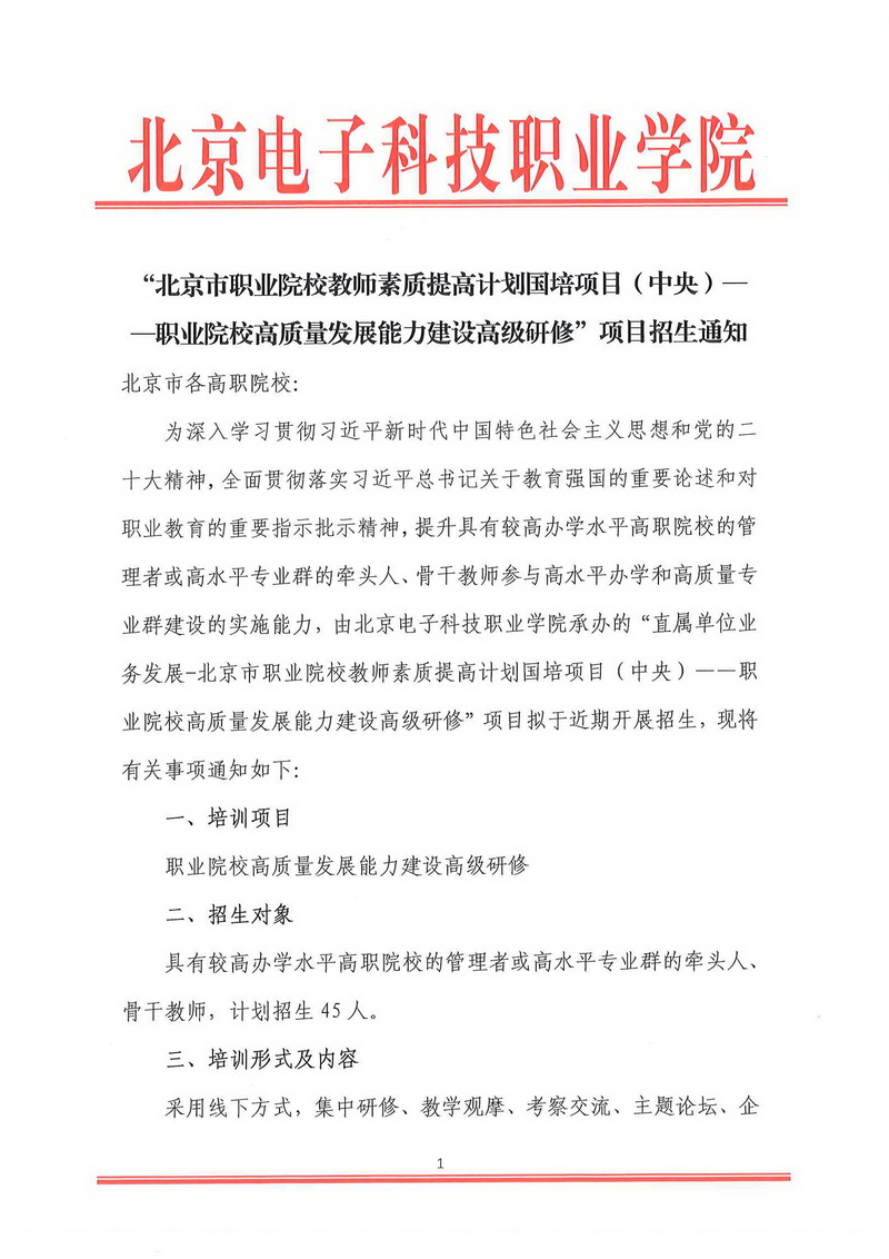 “北京市职业院校教师素质提高计划国培项目(中央)—职业院校高质量发展能力建设高级研修”项目招生通知
