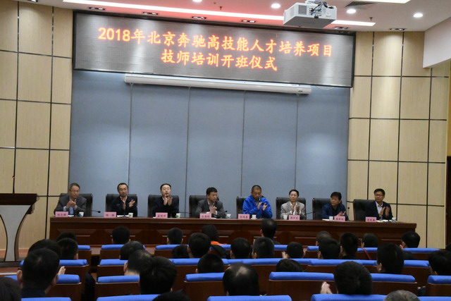 继续教育学院和汽车工程学院承办的北京奔驰汽车有限公司(北京奔驰)高技能人才培养项目-技师班培训于2018年4月15日在学校汽车工程学院报告厅举行开班仪式。北京经济技术开发区人事劳动和社会保障局局长任鸣晨、北京电子科技职业学院副校长么居标、北京奔驰培训部总经理孟继祥、北京奔驰培训部技术培训高级经理杨振、北京市工业技师学院副院长熊军权、北京市汽车技师学院副院长蒋开武、北京电子科技职业学院继续教育学院院长苏东海、北京电子科技职业学院汽车工程学院副院长冯志新和北京市工业技师学院培训处处长李玲琪出席开班仪式。此次北京奔驰技师培训共涉及汽车装调、汽车装焊、冲压、涂装、维修电工五个工种,培训人数达到170余人,是学校承担北京奔驰技师培训有史以来在工种和人数上空前的一次专业技能培训。