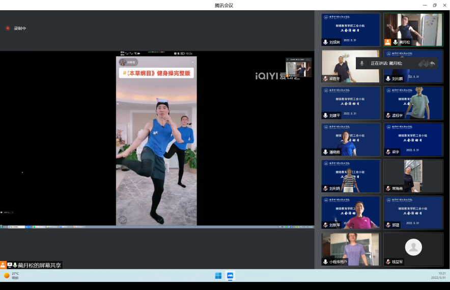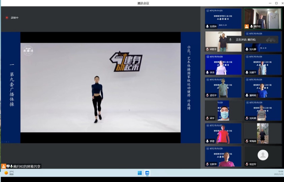 当前正值疫情防控的关键时期,加强体育锻炼提升自身免疫力是抵御病毒入侵的法宝,也是抗‘疫’重要方面。为树立以运动促健康、以健康防疾病的理念,达到强提质、抗疫情、增意志、调心态的目的,2022年5月31日,继续教育学院党支部联合工会小组开展了“强身健体,运动抗‘疫’”居家锻炼主题活动日活动。活动采取线上视频的方式,由继续教育学院工会小组长蔺月松主持,继续教育学院全体党员、工会会员参加。