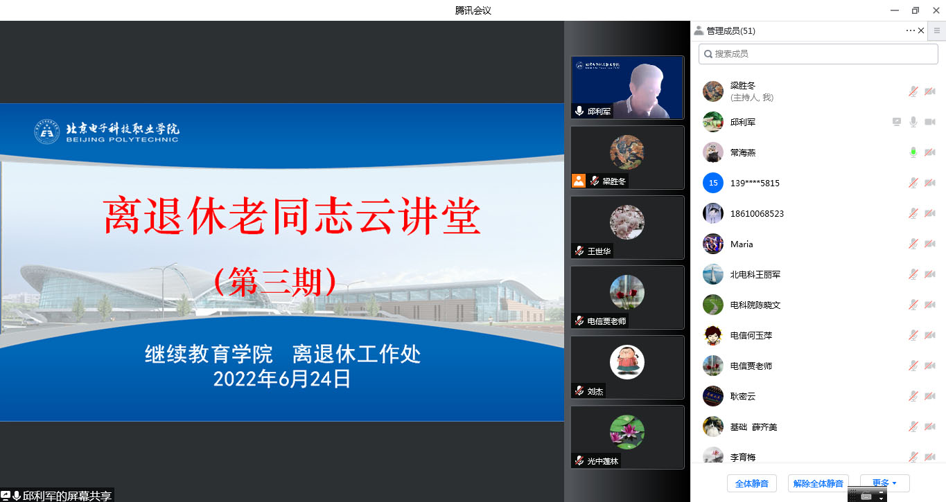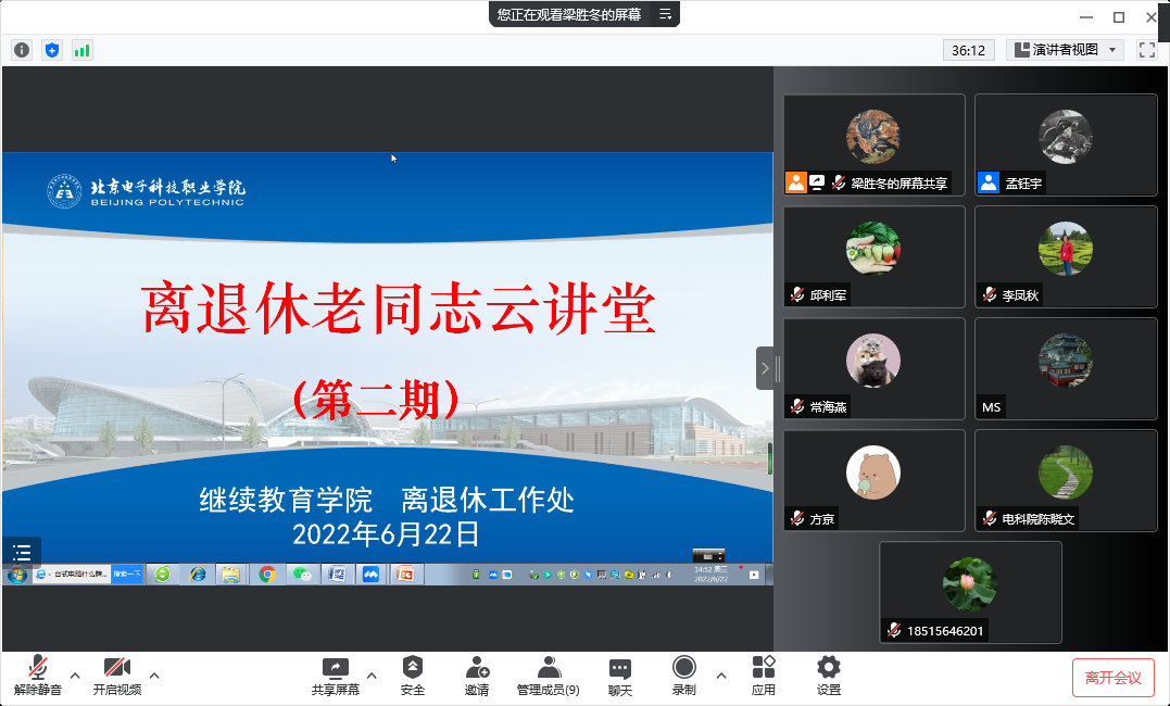 为深入贯彻落实市委、市政府《关于加强新时代首都老龄工作的实施意见》,进一步丰富离退休老同志的精神生活,满足离退休老同志老有所学,终身学习的需求,学校继续教育学院和离退休工作处联合举办了北京电子科技职业学院离退休老同志“云讲堂”活动。继5月27日开展了第一期活动后,于6月22日、24日陆续举办了第二、三期讲座,“云讲堂”继续采用线上腾讯会议的方式开展,由继续教育学院常海燕老师主持。
