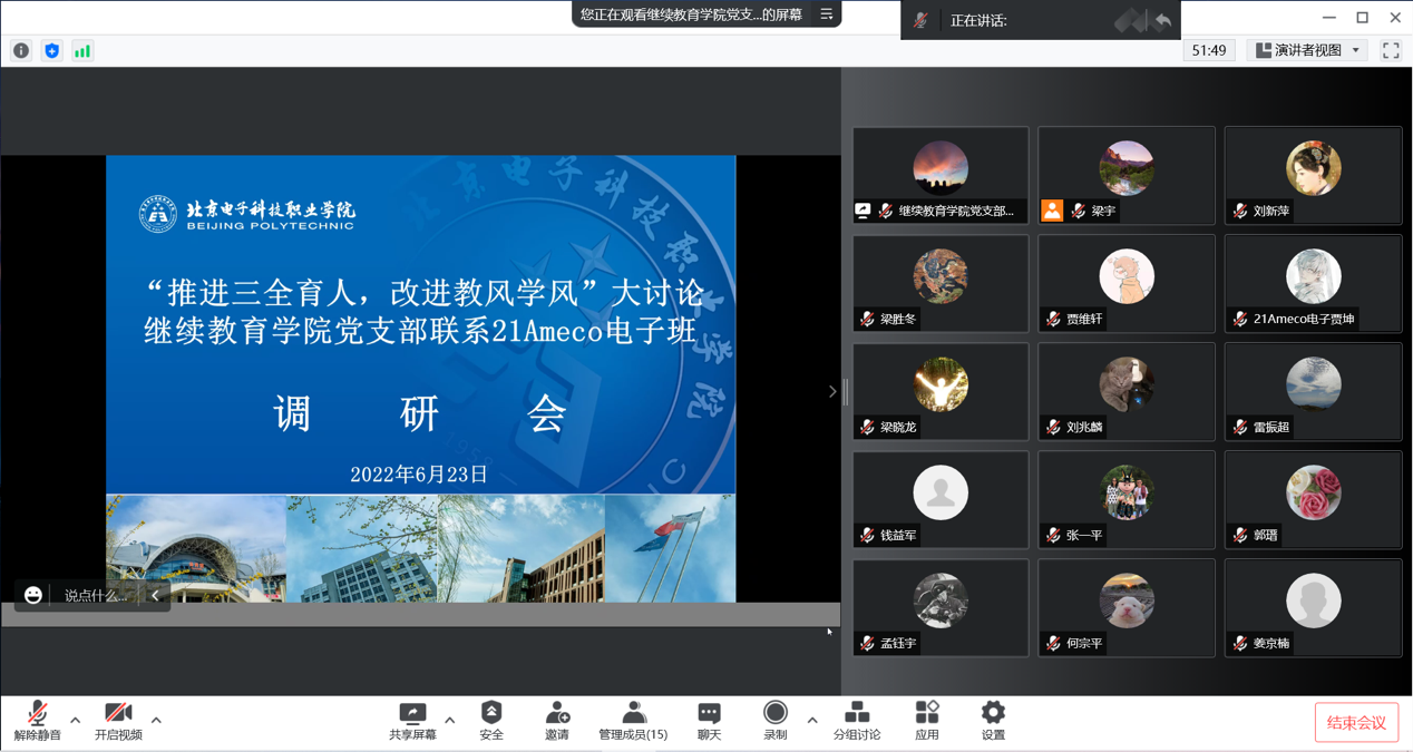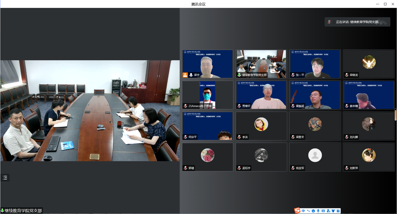2022年6月23日,在充分学习的基础上,结合“抓管理 促服务 严教风 正学风”的主题,继续教育学院全体党员干部、群众与党支部联系班级--航空工程学院21Ameco电子班班主任及学生代表通过腾讯会议的方式开展了广泛、深入的调研活动,充分听取了班主任老师及学生代表的意见和建议,进一步梳理和归纳出了班主任老师和学生代表在教学管理、学生管理和服务管理等方面提出的问题,为“大讨论”活动取得实效奠定了基础。