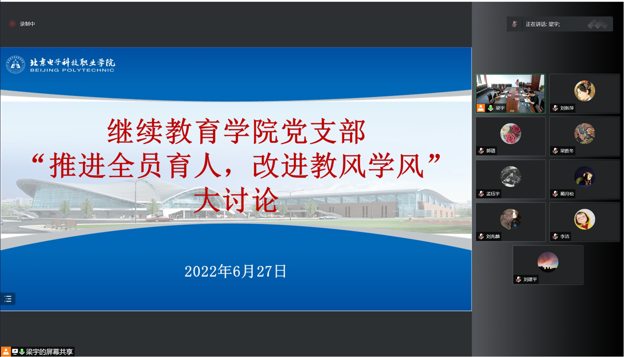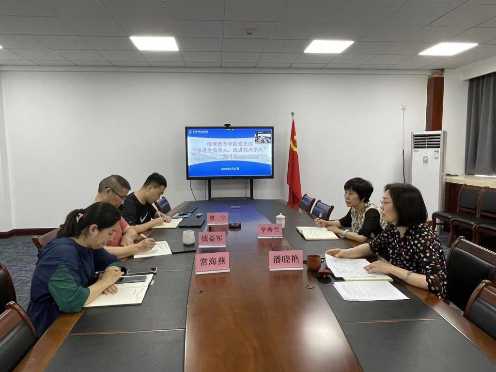 潘晓艳在总结发言中指出,继续教育学院党支部自6月份以来,按照学校和机关党委的统一部署,积极开展教风学风建设大讨论活动,达到了预期的工作目标,工作成效显著。通过深入调研,我们了解到了学生的困惑和需求,制定了切实有效的措施助力学生成长成才;通过全员大讨论,我们全面总结梳理了近年来本支部在促进社会培训人才培养,推动学校事业发展方面的经验,分析了当前管理、服务工作现状,查找了党支部在促进教风、培育学风工作中的存在的问题、不足与差距,探讨了改进的方法途径和措施。继续教育学院党支部全体党员将以本次活动为出发点,进一步落实各项工作措施,以实际行动帮助学生成长与成才,以优良党风强支部作风,严明教风,清正学风,踔厉奋发,为学校高质量发展努力奋斗。