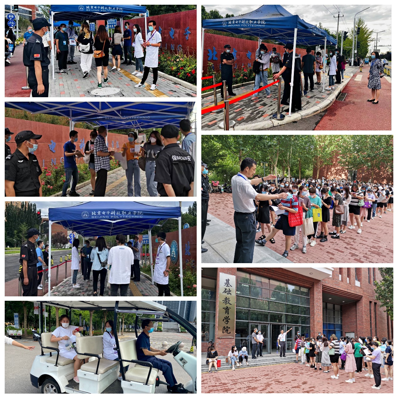在当前北京疫情防控工作常态化的管理要求下,组织大规模社会化考试压力巨大。为保证考试顺利进行,继续教育学院党支部全体党员、群众积极发挥党员先锋模范带头作用,严把疫情防控关,23日早上6:50分,全体党员、群众在学校南门集合,分组开展考生入校查验北京健康宝和准考证工作,引导考生走考试专用通道迅速达到考场外指定区域集合,排队等候进场。在此期间,积极协调保卫处、后勤基建处为孕妇考生提供电瓶车送考场和为考生提供饮用水等服务,满足考生基本需求,为考生解决实际困难,全心全意为考生服务。