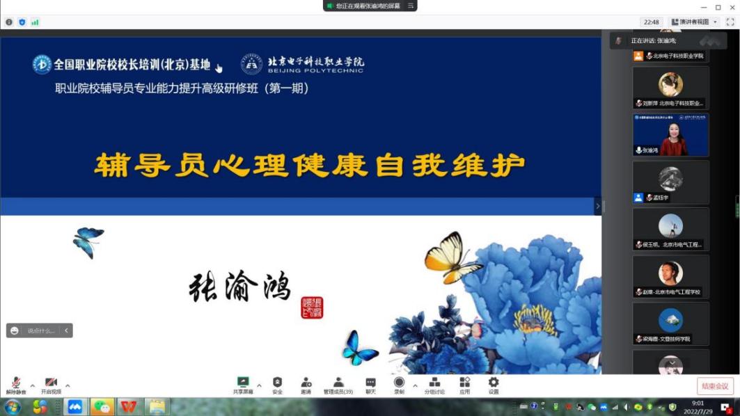 教育部国培项目专家库入库心理专家、北京师范大学特聘教授张渝鸿作了主题为《辅导员心理健康自我维护》的首场讲座。她通过生动有趣的线上互动方式,结合大量真实案例,给学员做了一场深度的心理辅导,帮助学员认识到辅导员是一个专业的、需要爱心的群体,在与学生交流的过程中,要具有爱的能力,要热爱自己的工作,做好自己的情绪管理,关爱学生,包容学生,尊重学生。