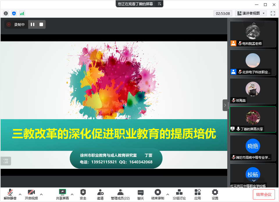 首场报告是由江苏省徐州市职业教育与成人教育研究室主任丁蕾做的《三教改革的深化促进与职业教育的提质培优》专题报告。丁蕾教授首先从指导思想、教学内容、教学设计、教学评价、教学反思和视频材料等6个方面详细解读了2022年全国职业院校技能大赛教学能力比赛的新变化和新动向,并从教案的设计与编写等方面讲解了参赛材料间关联性的重要性。在下半场的报告中,丁教授通过大量优秀的参赛视频为大家讲解了教学设计中如何融入课程思政、产教融合与校企合作等内容,如何体现教师“能讲会做”的“双师型”教师教学能力,如何体现教法改革等相关内容,并结合优秀教师的能力培养、新时代职业教育教师特质的内涵要求以及价值重建与文化重塑的内在要求、大数据分析与自适应技术、模块化课程结构等具体内容讲解了“三教”改革中教师是主体是根本、教材是基础、教法是途径三个大方面的内容,就如何深化三教改革,促进职业教育的提质培优,给大家做了精彩的报告。