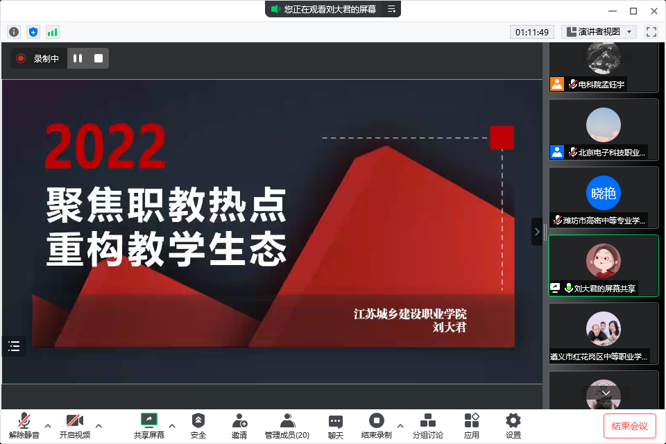 江苏城乡建设职业学院教育技术与信息中心主任刘大君作了题为《聚焦职教热点,重构教学生态》的专题报告,刘教授从指导思想、教学内容、模块化课程设计、教学实施、教学评价、教学反思等各方面,对全国教学能力大赛进行了全面的解读,结合丰富的案例,展示了公共基础课和专业课获奖作品的特色与亮点,对于各校教师积极备赛提供了深度指导与帮助。