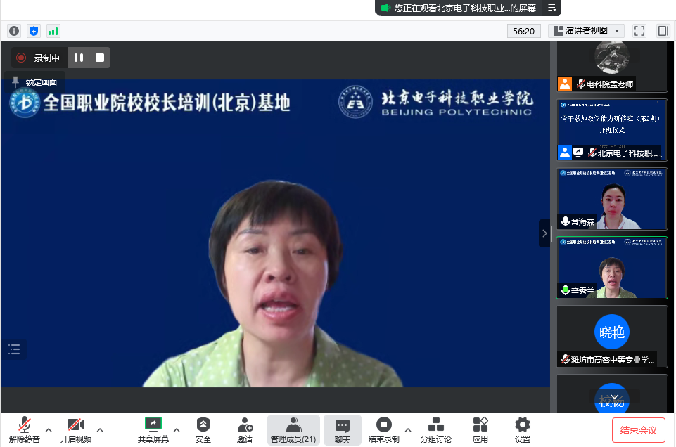 北京电子科技职业学院副院长辛秀兰在开班仪式上致辞。她指出,新修订的职业教育法正式实施,是我国职业教育发展的一个重要里程碑。党和国家对于职业教育高度重视,职业教育迎来了前所未有的发展契机,同时也对职教工作提出了更高的要求,职业院校必须不断提升办学理念,提高办学水平,为国家培育更多的高素质技能人才、能工巧匠和大国工匠。基地举办此次培训旨在不断提高一线教师的教学能力,提升参加全国教学能力比赛的竞争力。为了做好此次培训工作,基地精心设计了培训内容,邀请全国职业院校教学能力比赛评审专家和历届全国信息化教学大赛一等奖获得者进行线上授课,采取专题报告与研讨交流相结合的方式,聚焦职教热点,围绕教学比赛、教学设计与优化等内容开展经验分享与交流。