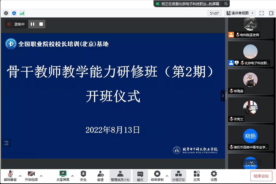 2022年8月13至14日,全国职业院校校长培训(北京)基地顺利完成了骨干教师教学能力研修班(第2期)的培训工作。本次培训采用腾讯会议线上培训的方式开展,来自北京、山东、贵州的一线教师参加了培训。