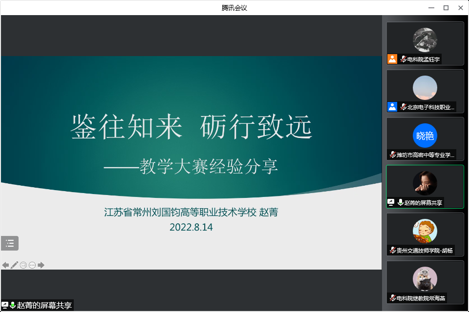 江苏省常州刘国钧高等职业技术学校语文学科带头人赵菁副教授为学员带来了以《鉴往知来 砺行致远—教学大赛经验分享》为主题的教学大赛经验分享报告,她以自己2017年参赛作品为例,结合近几年指导江苏队国赛的经历,从参赛选题、教学设计、实施报告撰写等方面进行了指导。