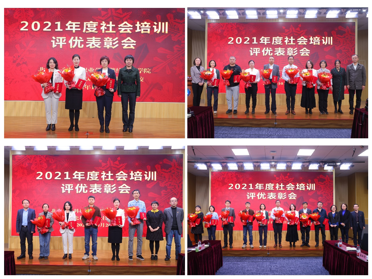 继续教育学院院长潘晓艳宣读2021年社会培训工作表彰决定。辛秀兰和各二级学院院长为获奖教师代表颁奖。