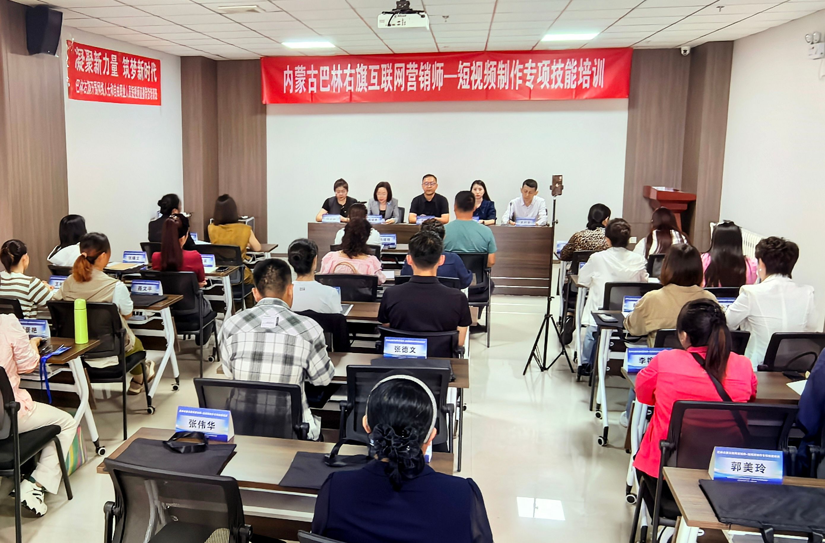 为深入学习贯彻习近平新时代乡村振兴战略思想,落实《中共中央国务院关于实施乡村振兴战略的意见》精神,8月21日,由北京电子科技职业学院继续教育学院承办的北京经济技术开发区职业技能培训协作巴林右旗互联网营销师——短视频制作专项技能培训在内蒙古赤峰市巴林右旗顺利开班。内蒙古巴林右旗农牧局副局长徐胜超、内蒙古赤峰市巴林右旗大舸文化传媒有限公司负责人隋亚丽、北京经济技术开发区社会事业局干部任梦雅、北京电子科技职业学院继续教育学院院长潘晓艳、北京电子科技职业学院艺术设计学院教师孙磊,以及来自巴林右旗的小型经营实体负责人、小微企业主、家庭农场主、餐饮服务行业人员、心理咨询师、主持人等就业创业人员共计40余人参加培训开班仪式。开班仪式由项目负责人孟钰宇主持。