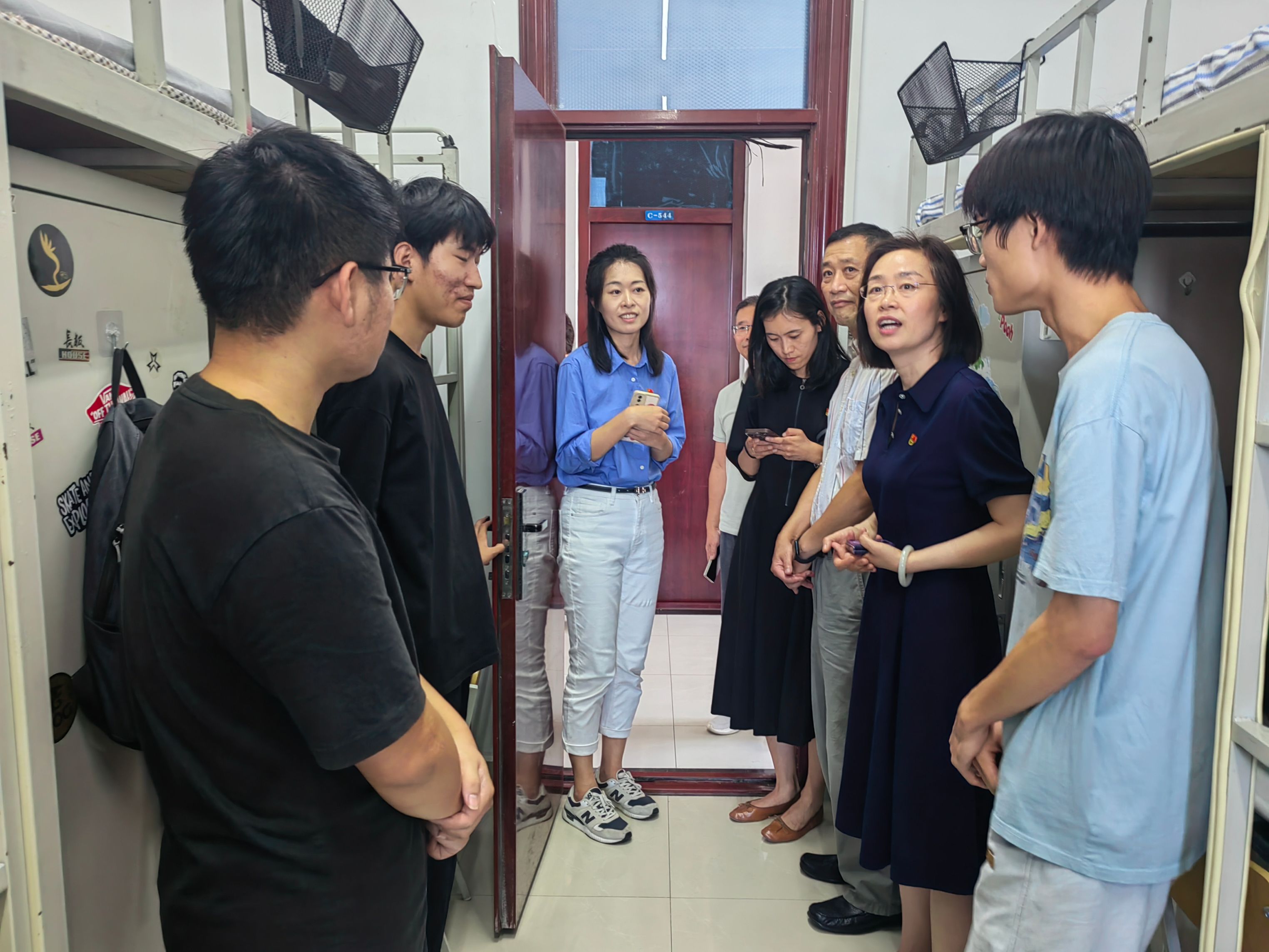 党支部书记潘晓艳带领支部党员逐楼层走进所联系班级学生的宿舍,关心大家在新学期里学习生活中的需求和困难,详细了解同学们的返校情况和对未来的规划,并仔细检查了宿舍环境卫生及用电安全。走访过程中,支部党员认真听取同学们的诉求,并给予耐心解答和指导。潘晓艳鼓励大家,新的学期已经开始,要及时调整心态,注意防范安全隐患,科学管理时间,加强体育锻炼,以奋发向上的崭新姿态投入到新学期的学习和生活中。