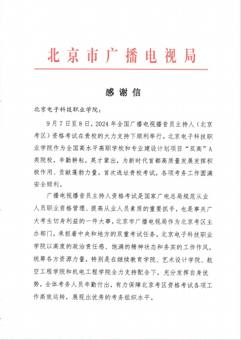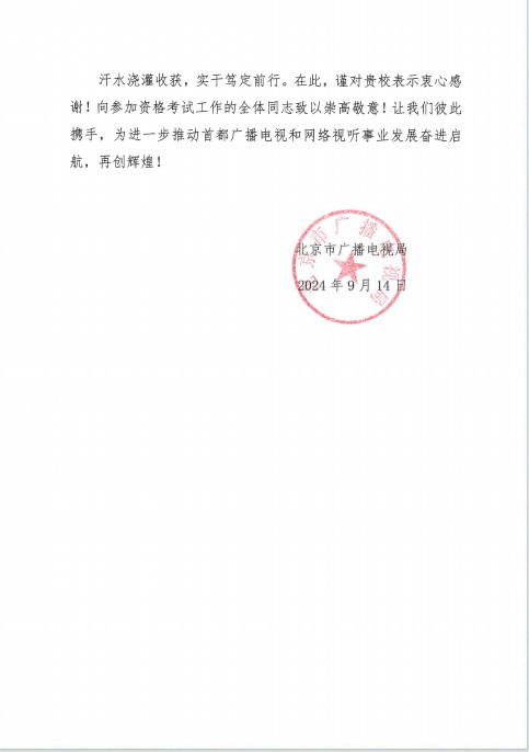 2024年9月14日,北京市广播电视局发来感谢信,对BEAT365圆满完成2024年全国广播电视播音员主持人资格考试组织工作表示感谢。